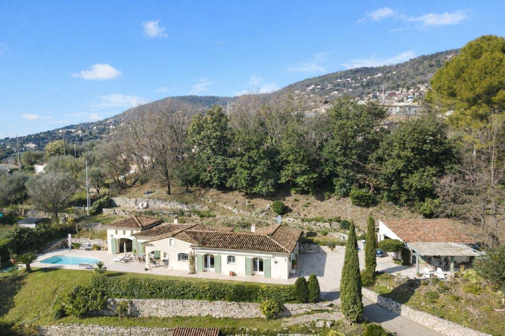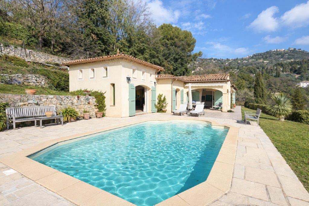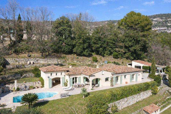 Côte d'Azur - Alpes-Maritimes: prachtige, stijlvolle villa (3 sk, 2 bk), in 1998 onder architectuur gebouwd, met fraai zwembad en gesitueerd op een onderhoudsarm terrein van 3.300 m² met panoramisch uitzicht zelfs op zee in de verte bij heldere dagen