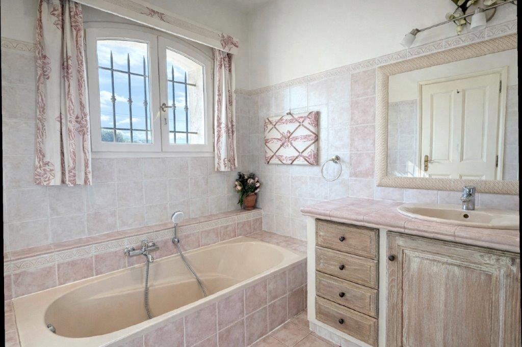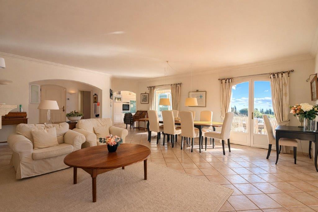 Indeling villa met op de begane grond een entree, toilet, royale woonkamer (in 2011 uitgebreid) met grote raampartijen die zorgen voor veel natuurlijk licht en een directe verbinding met de terrassen en de tuin. De ruime keuken biedt directe toegang tot het terras en het zwembad, ideaal om optimaal te genieten van het mediterrane klimaat. Verder beschikt de woning over een grote bijkeuken, een dubbele garage en meerdere terrassen rondom het huis. De woning beschikt verder over drie slaapkamers, waaronder een master suite met eigen badkamer en een tweede, gedeelde badkamer.