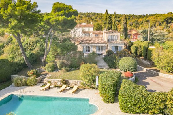 Côte d'Azur - Alpes-Maritimes: waanzinnig mooi op heuvel gelegen karakteristieke villa (4 sk, 3 bk) met zwembad, poolhouse en garage op 2.300 m² met panoramisch uitzicht op Middellandse zee en het charmante bergdorpje Cabris in achterland van Cannes