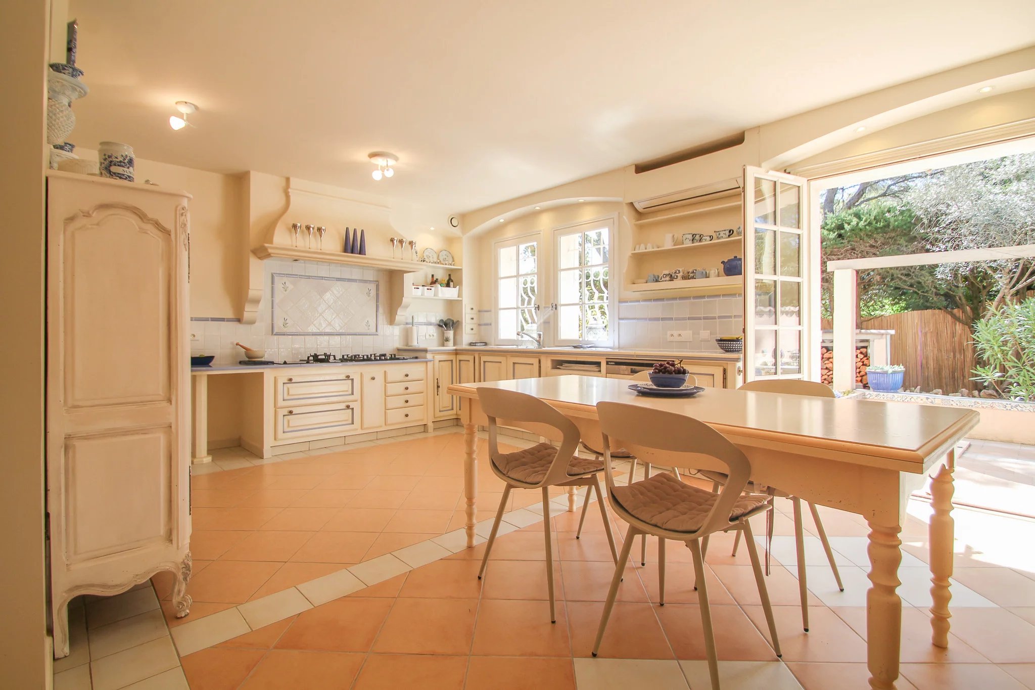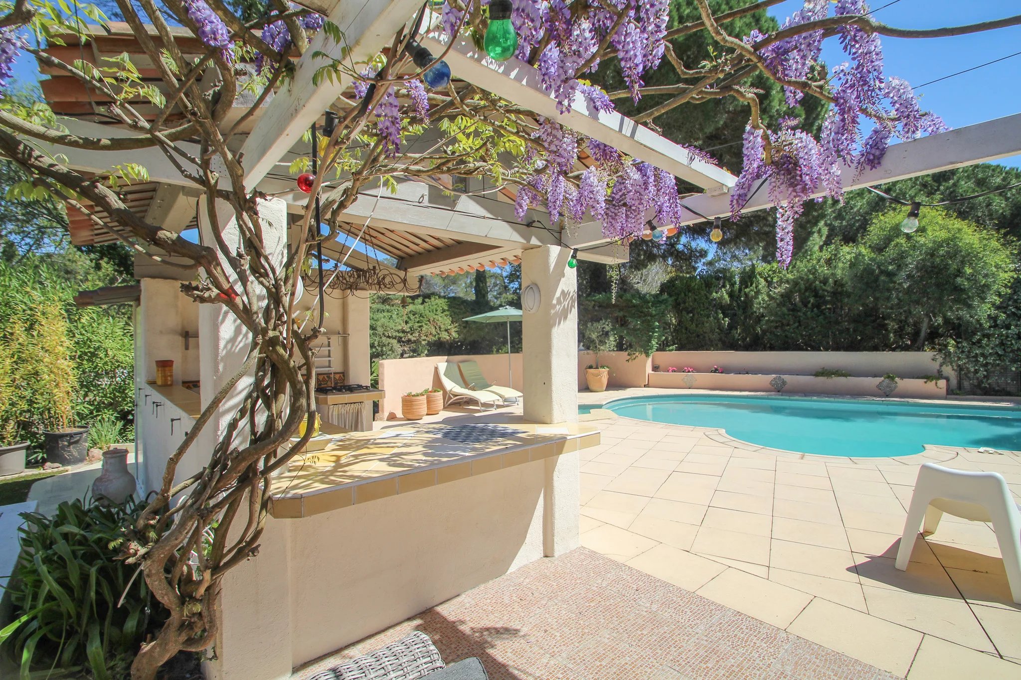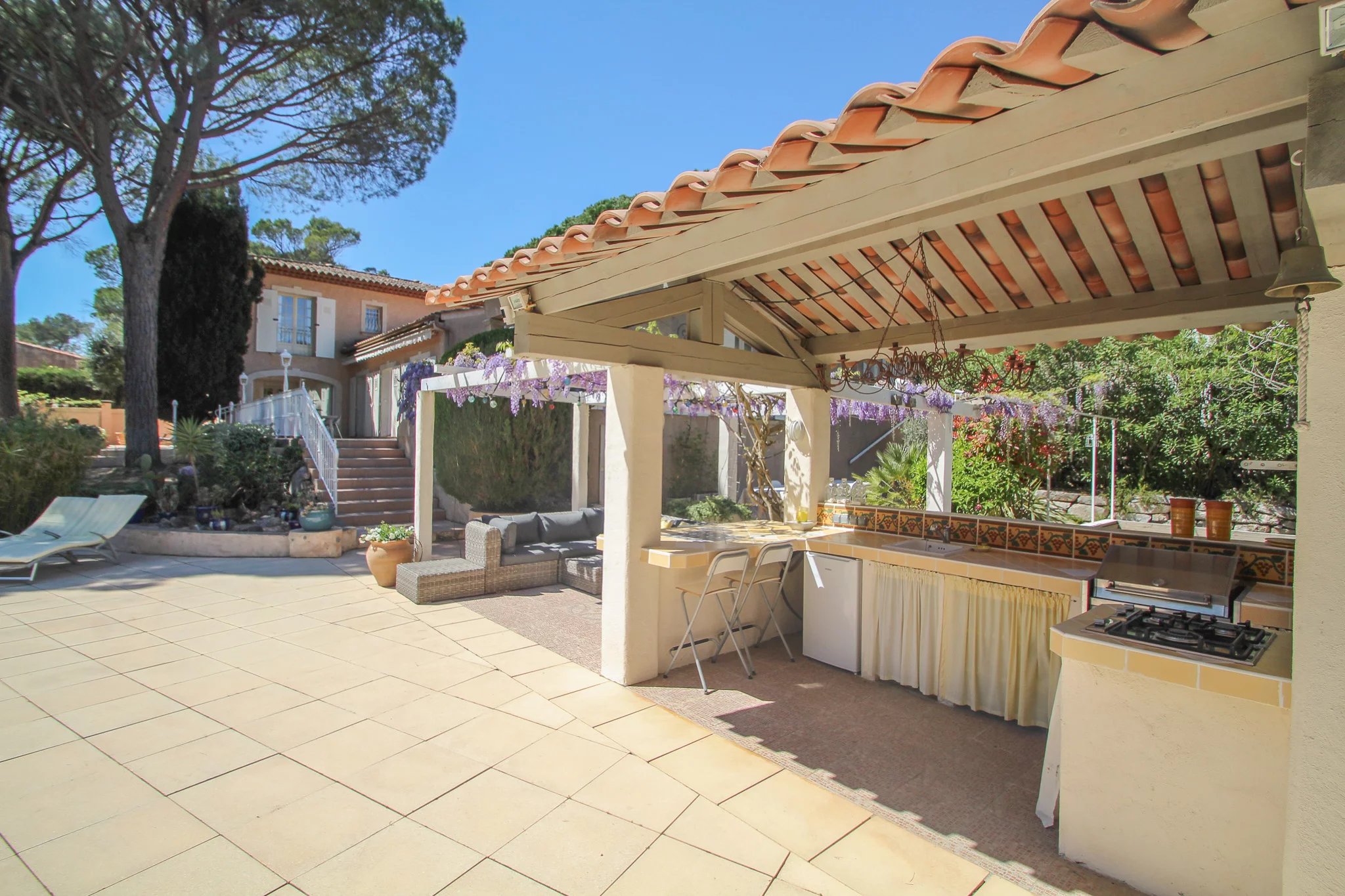 Rondom de elegante woning liggen meerdere terrassen en intieme zithoekjes, waardoor u de hele dag kunt genieten van zowel zon als schaduw. Het zwembad vormt een heerlijke plek om te ontspannen, aangevuld met een zomerkeuken en een jeu-de-boulesbaan.