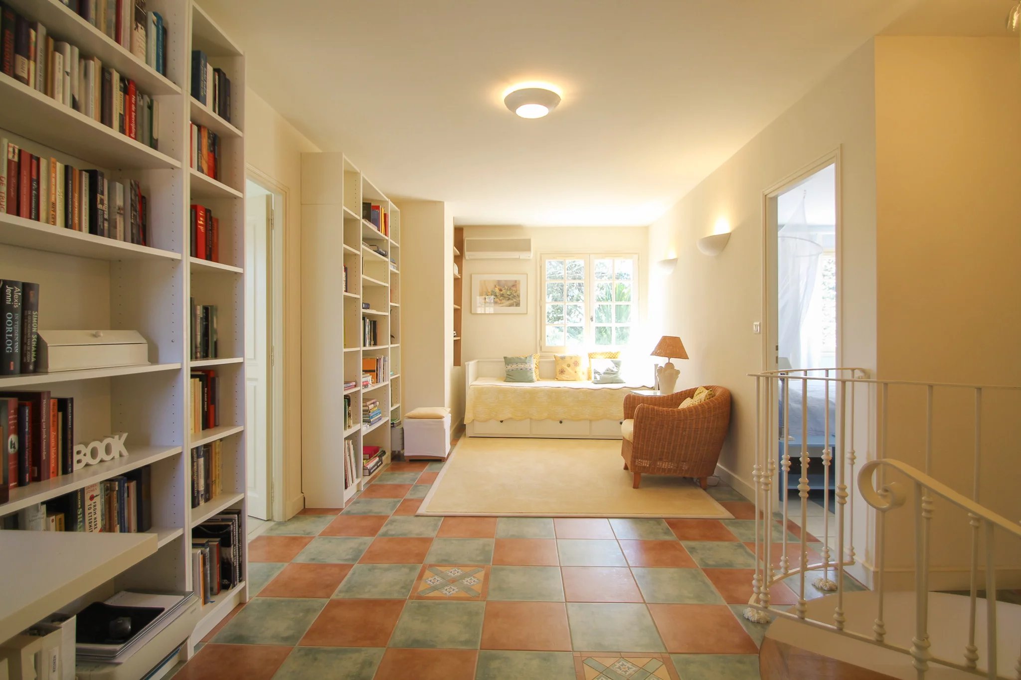 Op de bovenverdieping bevinden zich nog twee slaapkamers met eigen badkamers, een ruime overloop met een sfeervolle bibliotheek en extra werkplek, evenals een separaat toilet.