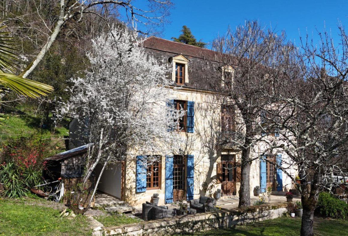 Dordogne - Périgord Noir: karakteristiek natuurstenen Périgordijns herenhuis, recentelijk geheel gerenoveerd, op locatie met 'vue château' aan de rand van één van de mooiste stadjes van de Dordogne-vallei op ca. 700 m² op loopafstand van winkels