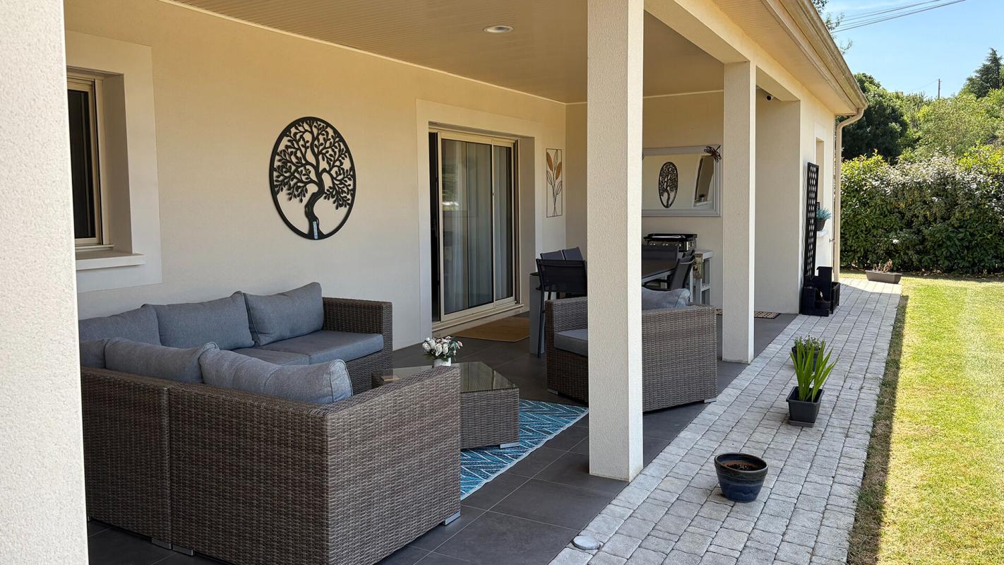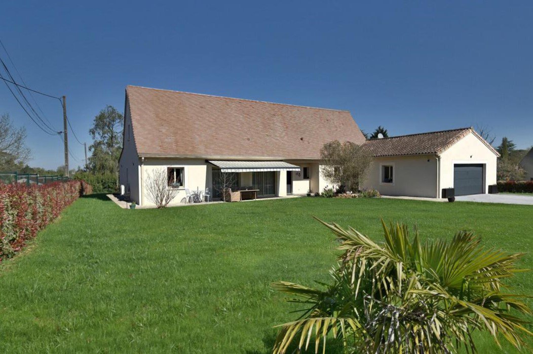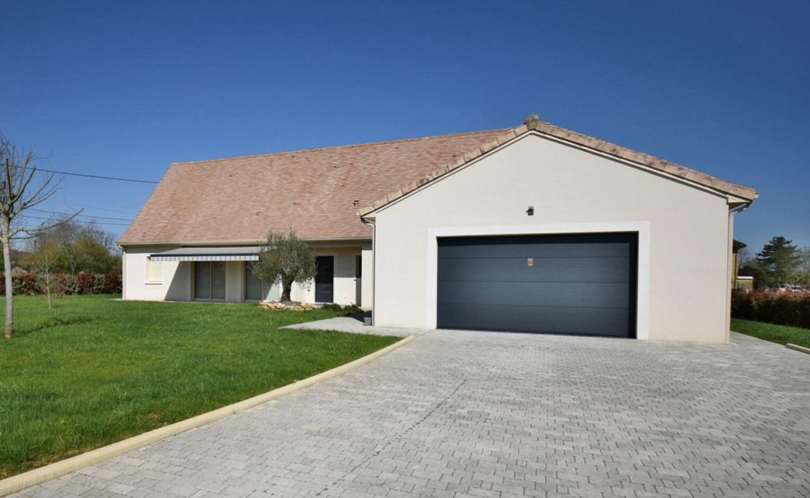 Dordogne - Périgord Noir: op 30 minuten ten zuiden van Bergerac ligt deze praktische, gelijkvloerse villa (3 sk, 2 bk) in nieuwstaat, gelegen op een vlak terrein van 1.859 m² met toegangspoort vlakbij het centrum van een charmant stadje met winkels