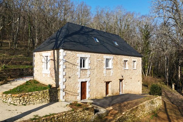 Dordogne - Périgord Noir: op een rustige locatie zonder directe buren ligt deze authentieke woning (3 sk, 2 bk), recentelijk geheel gerenoveerd met nieuwe septic tank en duiventil; natuurlijk terrein van 1,2 hectare met bron bij aantrekkelijk marktstadje