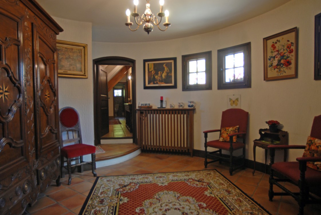 Indeling woonhuis met op de begane grond een entree/hal (3 bij 2 meter) met garderobe en toilet, centrale hal in de ronde toren (diameter 5,5 meter) met trap naar de bovenverdiepingen en onderste verdieping, woonkamer (6 bij 8 meter) met stenen open haard, openslaande deuren naar een eerste overdekt terras (4 bij 3 meter met barbecue, en twee openslaande tuindeuren naar een tweede overdekt terras (3 bij 7 meter), eetkamer (14 m²), ingerichte keuken (5 bij 7 meter) met twee openslaande tuindeuren naar een terras, kantoortje (2 bij 4 meter), slaapkamer (4 bij 5 meter) met dubbele openslaande tuindeuren naar het terras boven de garage, badkamer met toilet met dubbele openslaande tuindeuren naar het terras, slaapkamer van 3 bij 4 meter en badkamer met toilet.