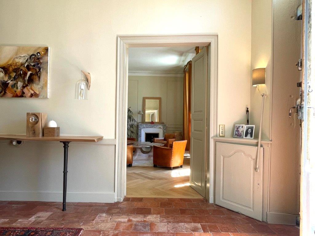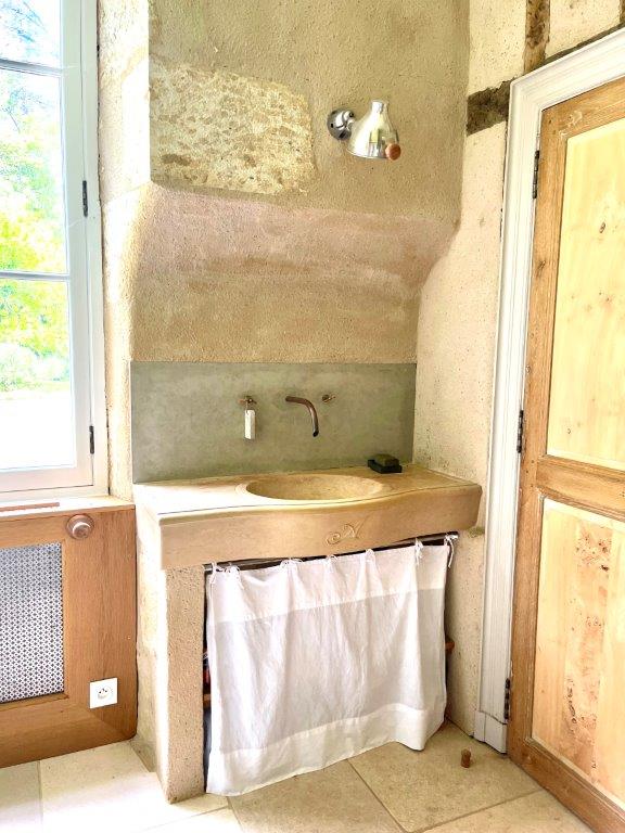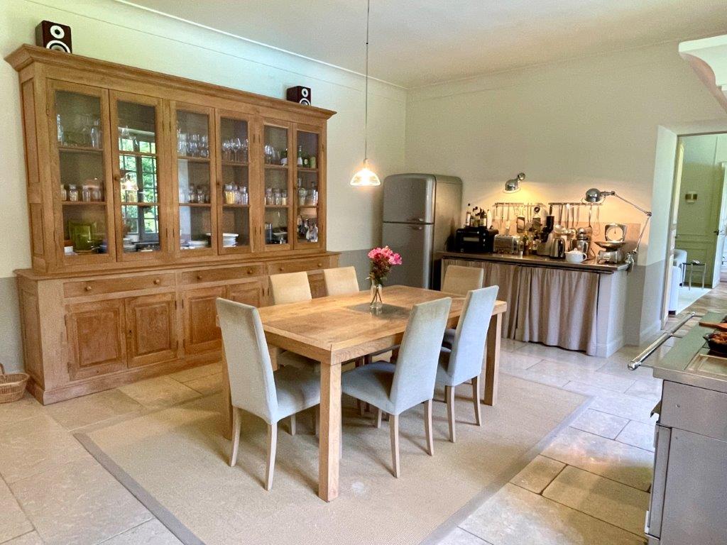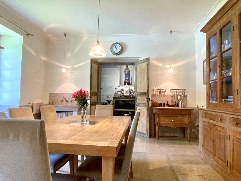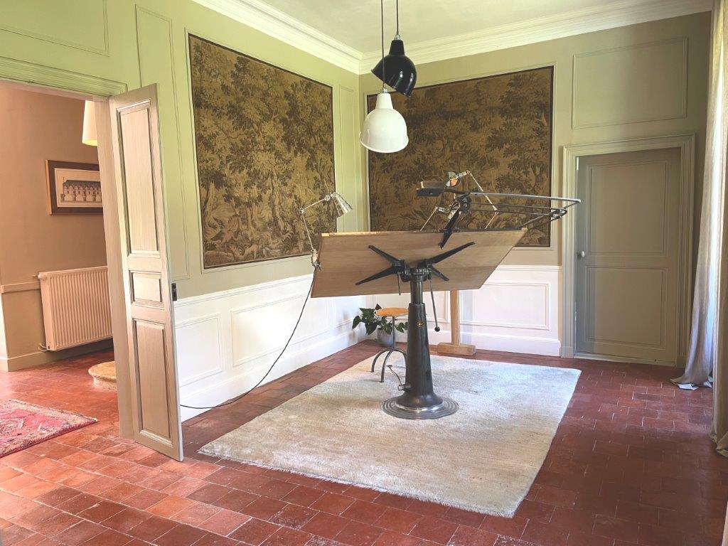 Indeling Maison de Maître met op de begane grond een indrukwekkende dubbele eikenhouten voordeur, typerend voor 18e-eeuwse adellijke huizen, met toegang naar een ruime centrale entreehal met terracotta vloer. Rechts bevindt zich een elegante salon met nissen, links een groot kantoor. Aan de achterzijde, met uitzicht op de tuin en het zwembad, bevindt zich een tweede salon, een tekenkamer, een ruime eetkeuken en een bijkeuken met toilet.