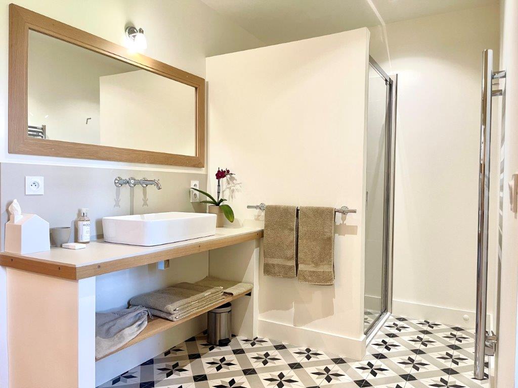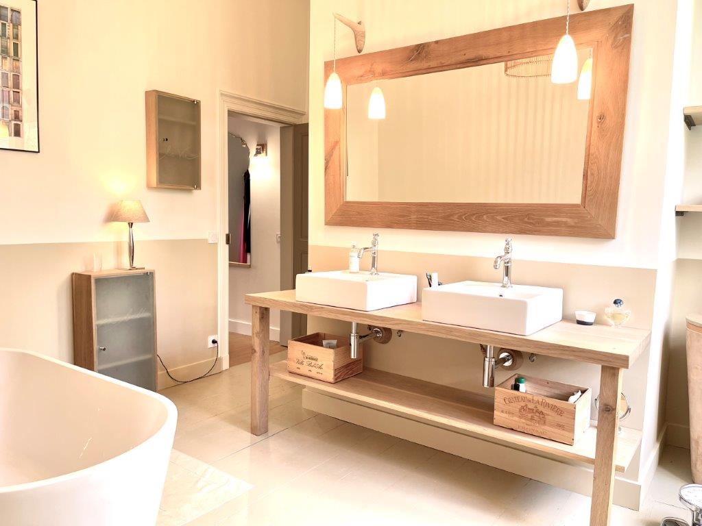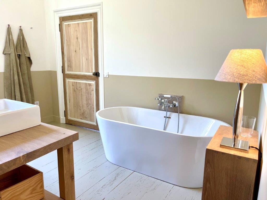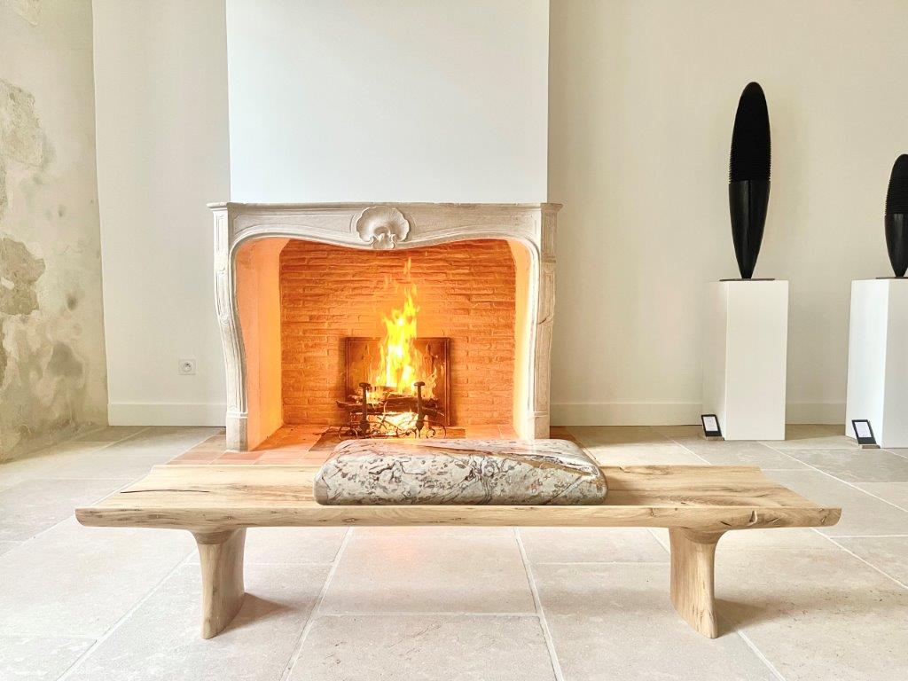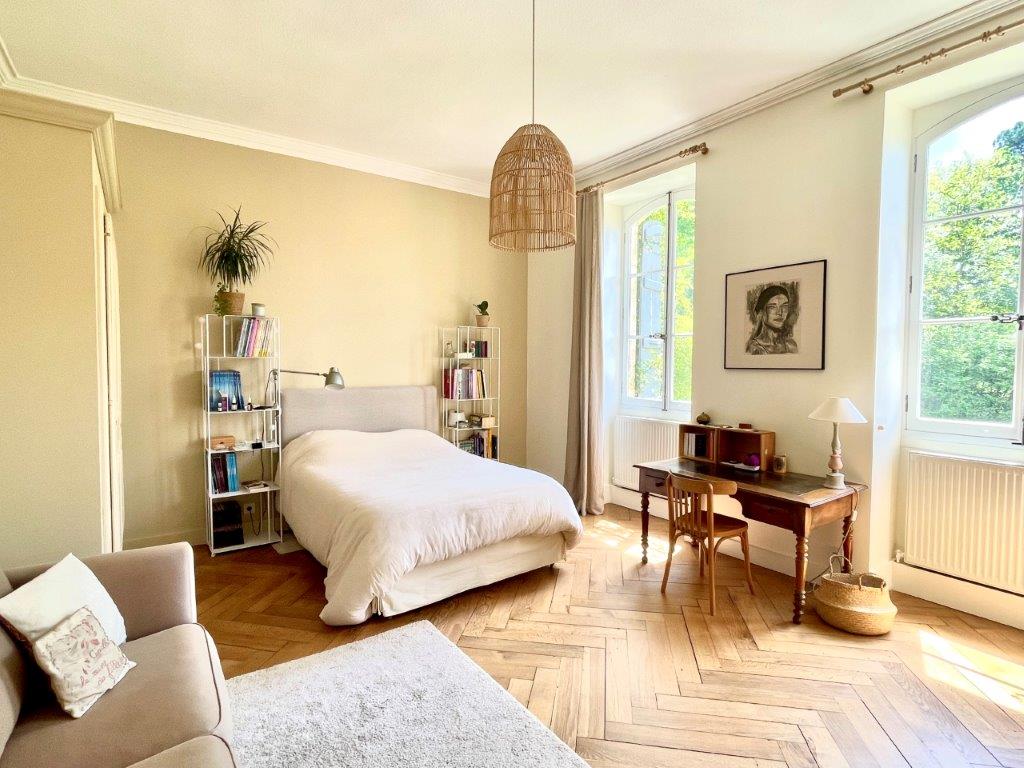 Indeling Maison de Maître met op de begane grond een indrukwekkende dubbele eikenhouten voordeur, typerend voor 18e-eeuwse adellijke huizen, met toegang naar een ruime centrale entreehal met terracotta vloer. Rechts bevindt zich een elegante salon met nissen, links een groot kantoor. Aan de achterzijde, met uitzicht op de tuin en het zwembad, bevindt zich een tweede salon, een tekenkamer, een ruime eetkeuken en een bijkeuken met toilet.