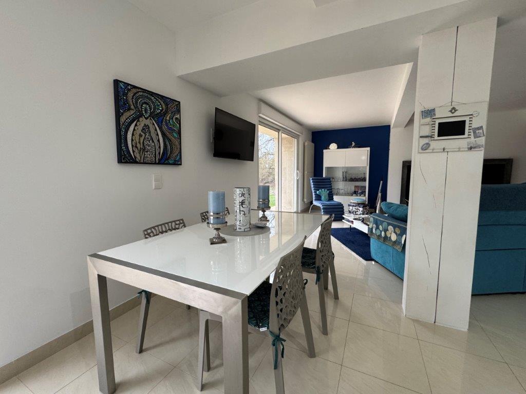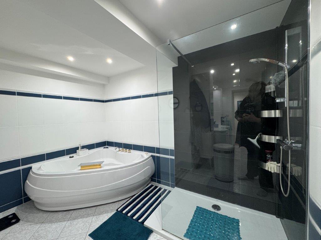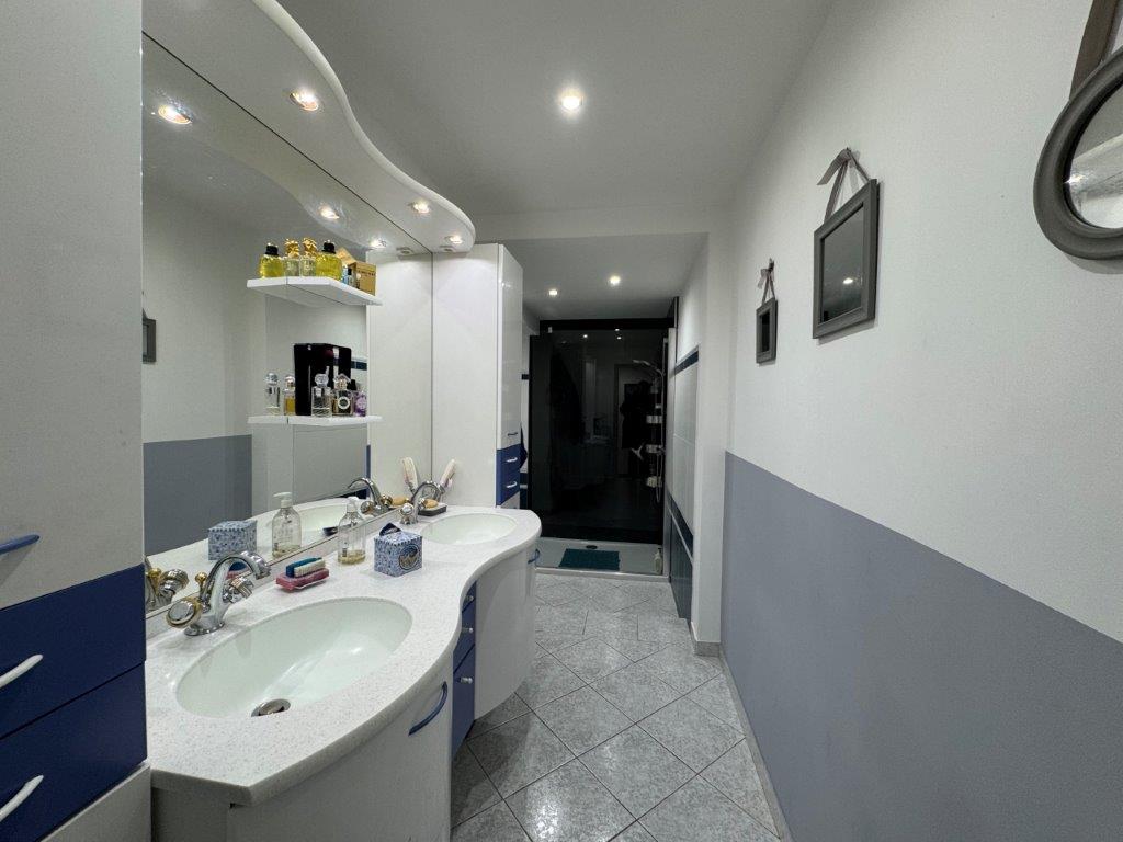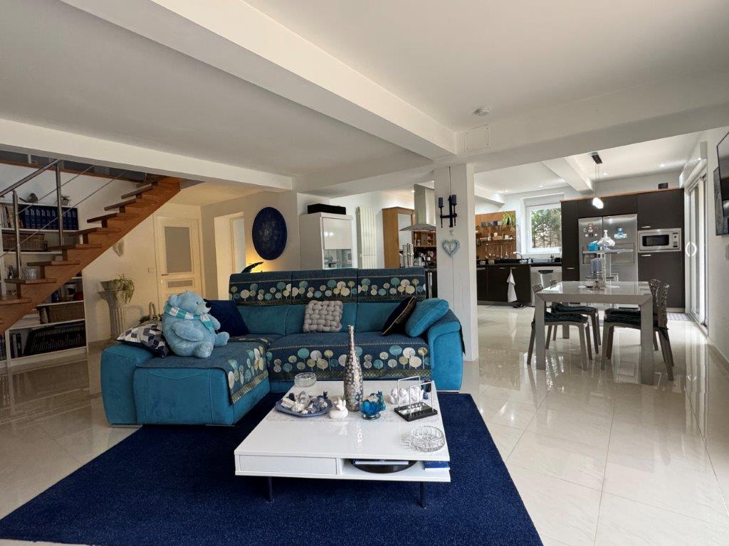Indeling woonhuis: entree, ruime en met veel natuurlijk licht overgoten woonkamer met twee grote schuifpuien, moderne, volledig uitgeruste keuken. De schuifdeuren zorgen voor een naadloze overgang naar de tuin en het zwembad, wat een perfecte harmonie creëert tussen binnen- en buitenruimtes. Het huis beschikt verder over vijf slaapkamers, twee inloopkasten, drie moderne badkamers en een extra woonkamer/salon op de bovenverdieping, ideaal voor ontspanning.