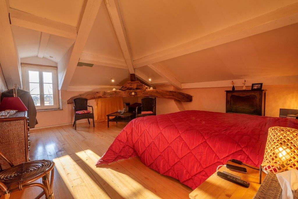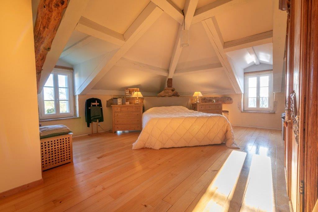 Op de verdieping een overloop (31 m², ruimte voor een kantoor en berging), slaapkamer (26 m², 13 m² met minimale stahoogte, hoofdslaapkamer (74 m²) met badkamer (douche, bad, wastafel en toilet) plus kleedkamer.
