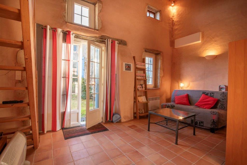 De gîte heeft een open indeling met woonkamer (21 m²) met open keuken en airconditioning, badkamer met o.a. douche, wastafel, toilet en op de mezzanine/vide met slaapkamer (13 m²) met goede stahoogte.
