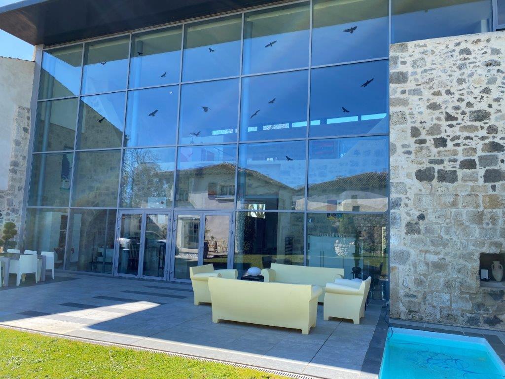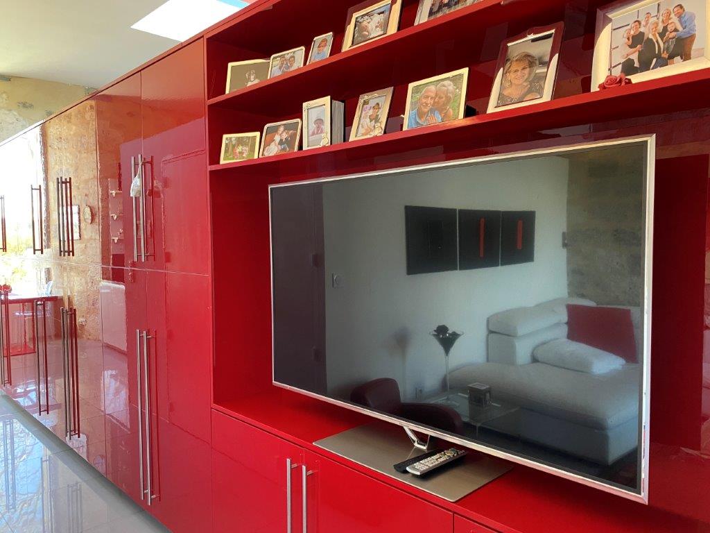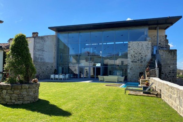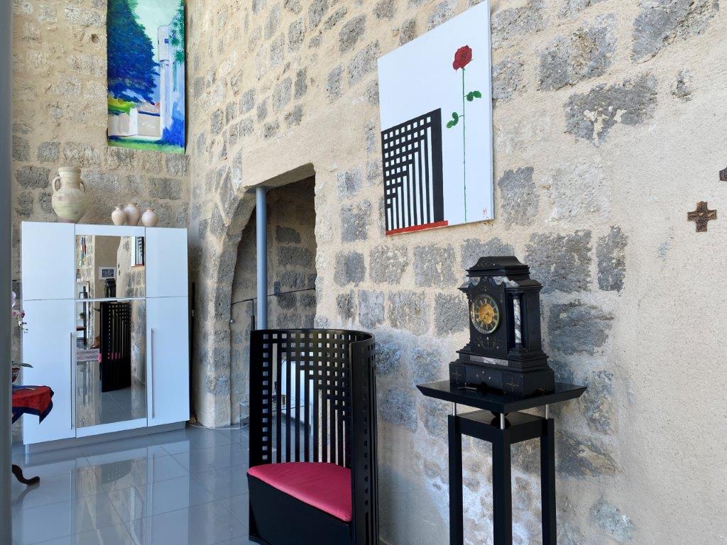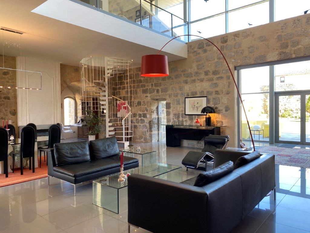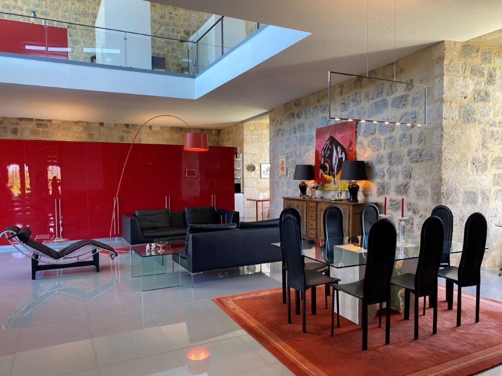 De designwoning (267 m² woonoppervlak) is overgoten met natuurlijk licht dankzij een indrukwekkende glazen wand van vloer tot plafond, biedt heerlijke leefruimtes. Bij binnenkomst wordt men op de begane grond verrast door de voormalige kerker die is omgetoverd tot een prachtige wijnkelder. De 84 m² grote woonkamer is warm en elegant, met een open haard met inzet. Deze wordt vervolgd door een volledig ingerichte en uitgeruste keuken met bijkeuken, een TV-lounge en een badkamer.
