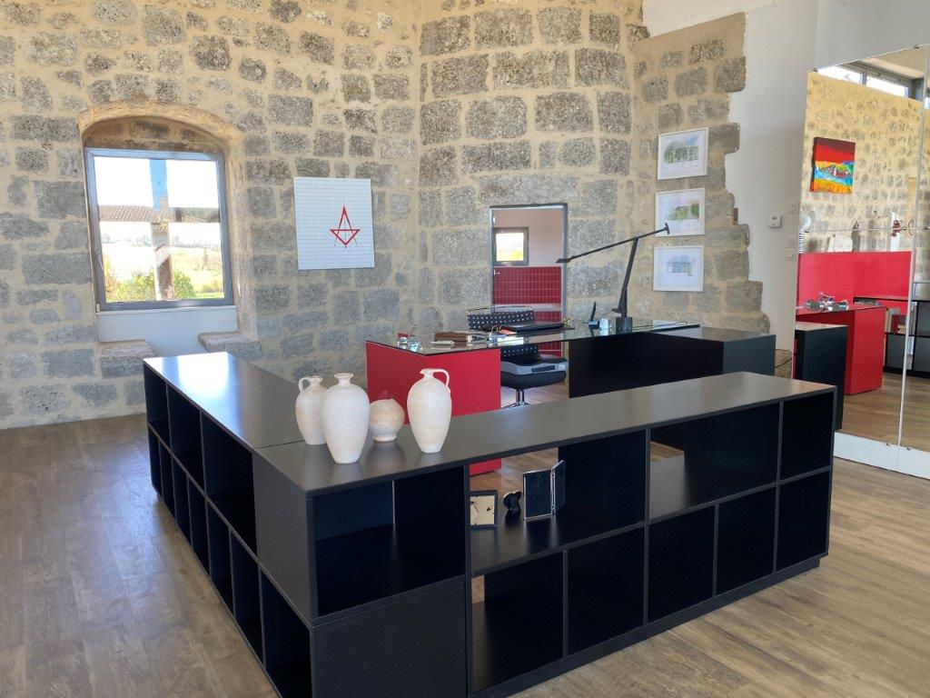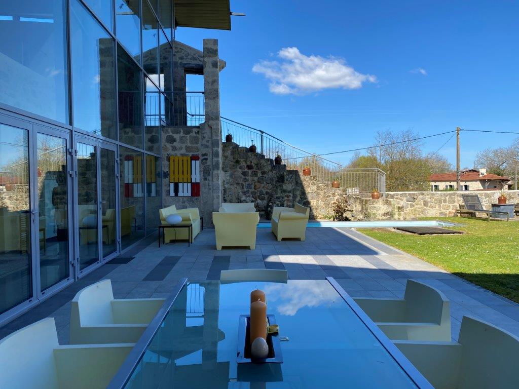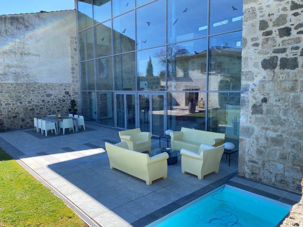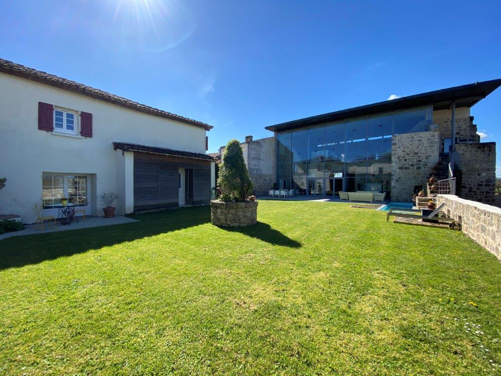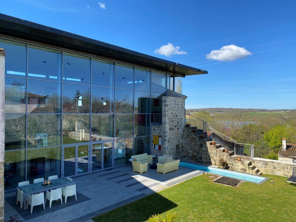 Gascogne - Gers: uit de topcollectie van B&D France; moderne designwoning, onder architectuur gebouwd op de fundamenten van middeleeuws kasteel, met separaat gastenhuis, zwembassin en fraai ver uitzicht, gelegen op 830 m² grond in een charmant dorpje