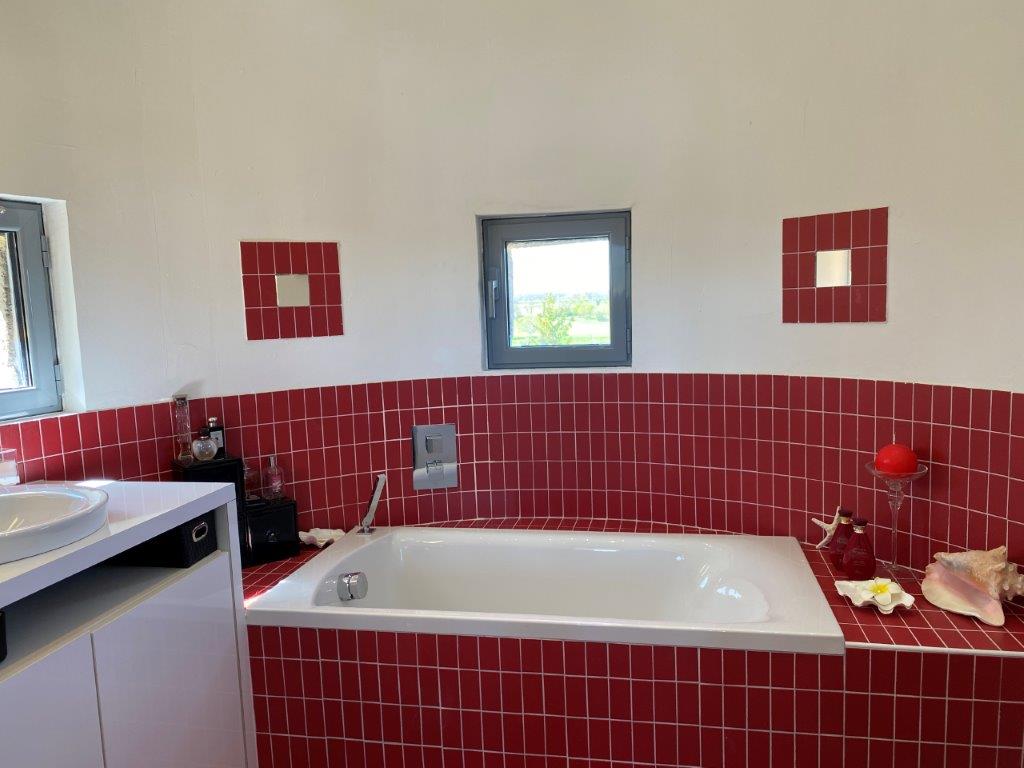 Op de bovenverdieping, open naar de begane grond, bevinden zich de hoofdslaapkamer met inloopkast en ruime badkamer (douche), een werkkamer, een badkamer in de toren, een klein schildersatelier en een terras van 13 m² met een prachtig uitzicht.