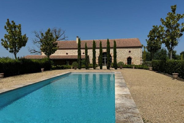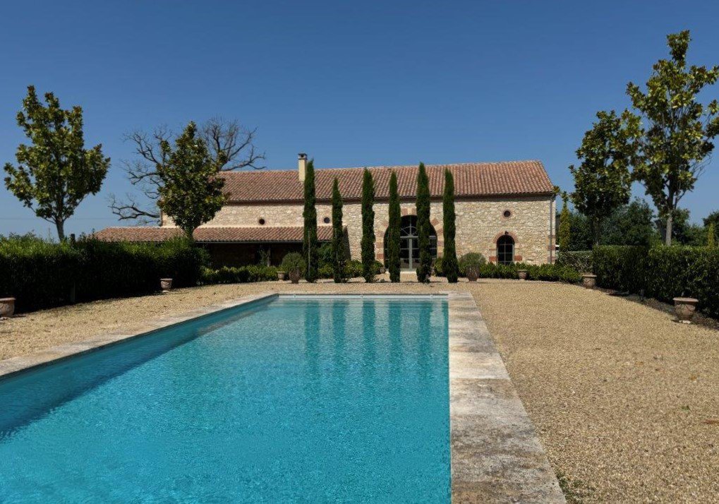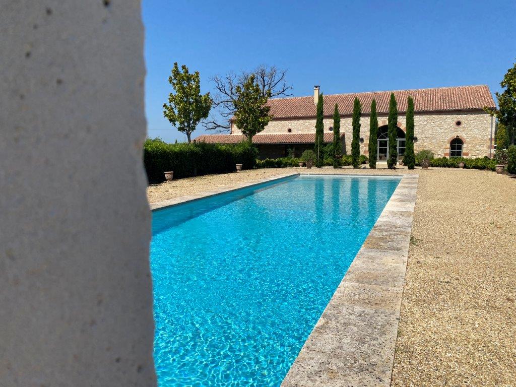 Gascogne - Gers: zeer elegant, in 2021 gerestaureerd Frans landhuis uit natuursteen, een voormalig wijngebouw, met verwarmd zwembad en rustig gelegen op ca. 1 hectare zonder directe buren aan eind van eigen oprijlaan in schitterende heuvelachtige omgeving