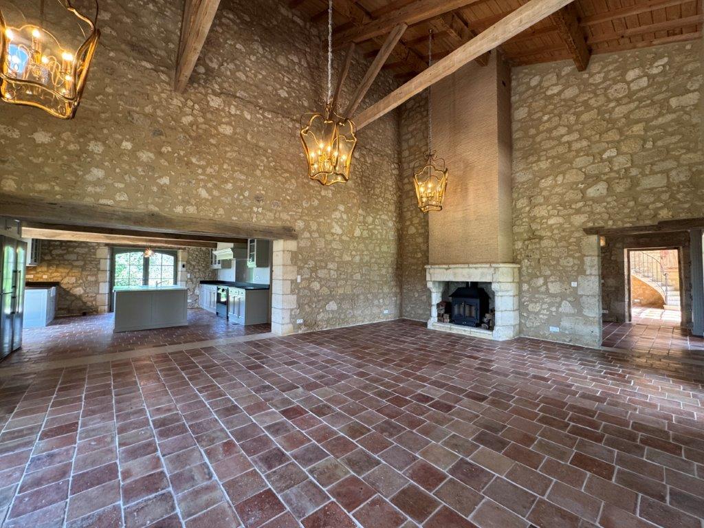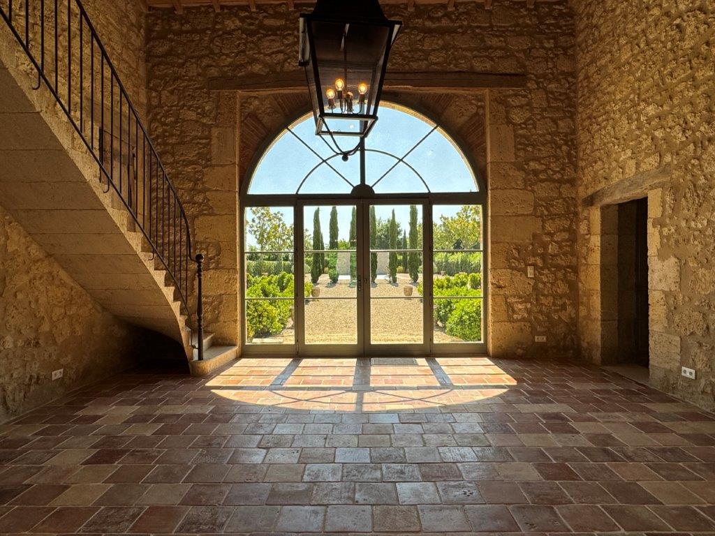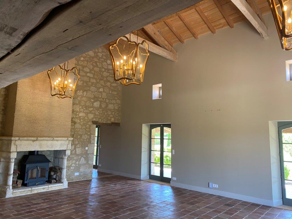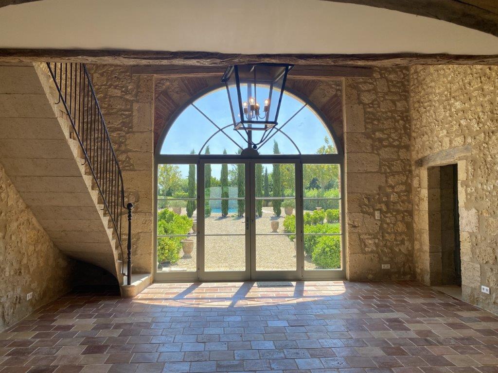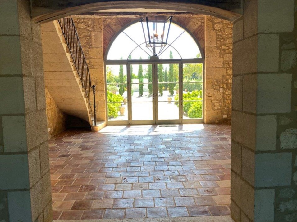 Indeling landhuis met op de begane grond de centrale hal (de blik wordt meteen getrokken naar de tuin en het zwembad, met een elegante fontein op de achtergrond), ruime, volledig uitgeruste keuken in open verbinding met een lichte en luchtige leefruimte/woonkamer met indrukwekkende volumes, een kathedraalplafond en een open haard met houtkachel. Vijf dubbele openslaande deuren laten overvloedig daglicht binnen en bieden toegang tot twee terrassen: een grote overdekte terras aan de oostzijde en een tweede, beschaduwd door een majestueuze blauwe regen, aan de zuidzijde.