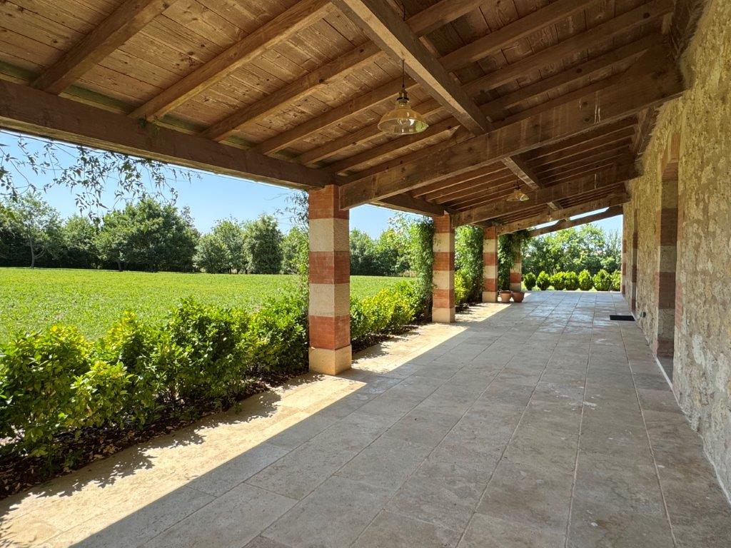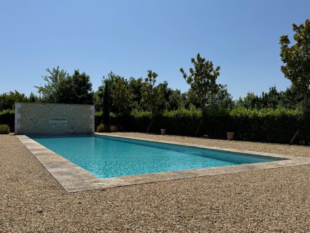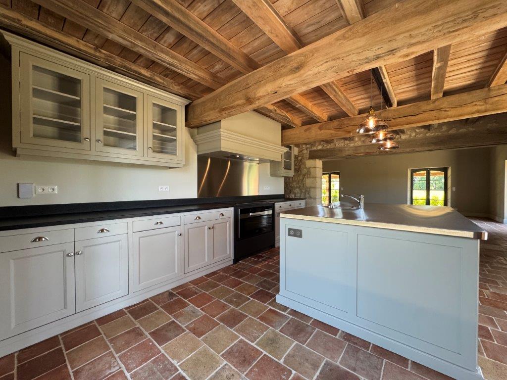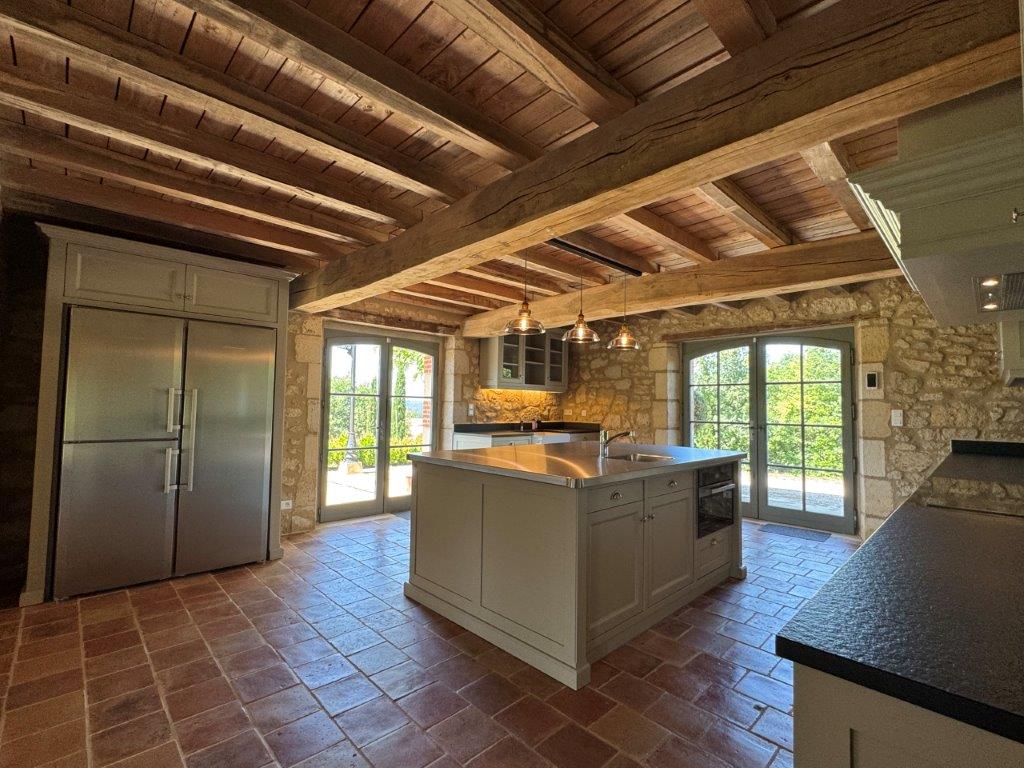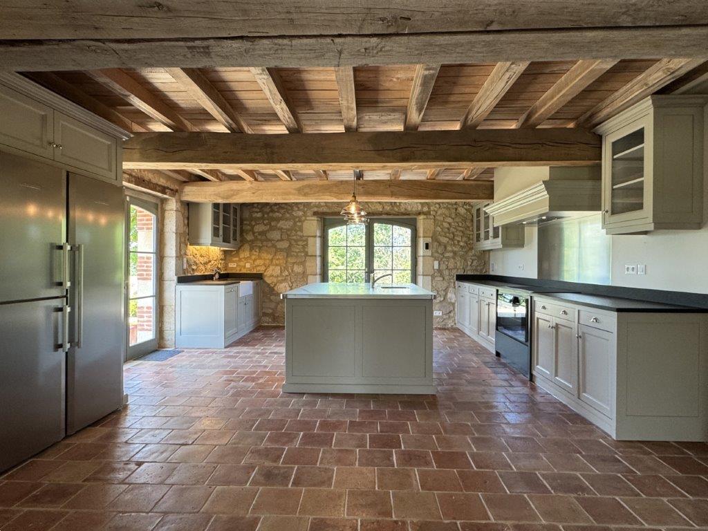 Indeling landhuis met op de begane grond de centrale hal (de blik wordt meteen getrokken naar de tuin en het zwembad, met een elegante fontein op de achtergrond), ruime, volledig uitgeruste keuken in open verbinding met een lichte en luchtige leefruimte/woonkamer met indrukwekkende volumes, een kathedraalplafond en een open haard met houtkachel. Vijf dubbele openslaande deuren laten overvloedig daglicht binnen en bieden toegang tot twee terrassen: een grote overdekte terras aan de oostzijde en een tweede, beschaduwd door een majestueuze blauwe regen, aan de zuidzijde.