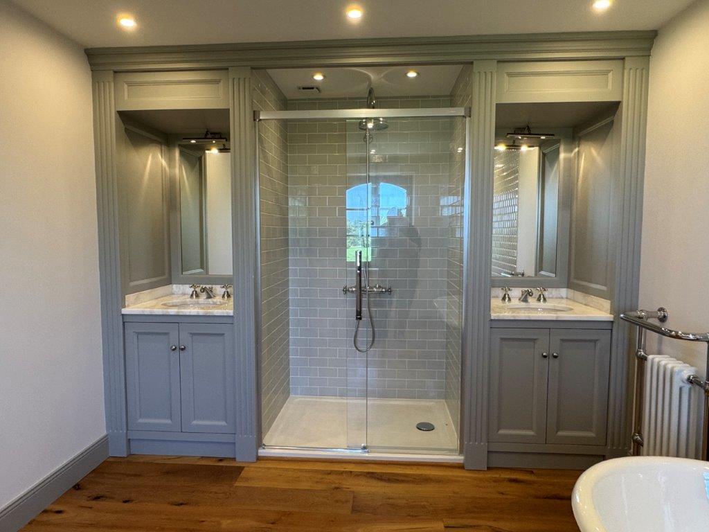 Een elegante stenen trap leidt naar de verdieping, waar de ouderslaapkamer uitkomt op een charmant balkon met adembenemend uitzicht over het omringende landschap. Deze suite beschikt over een royale badkamer met inloopdouche, ligbad, dubbele wastafel en een ruime inloopkast. Drie extra slaapkamers, elk met eigen douche of badkamer, evenals een linnenkamer, maken dit niveau compleet.