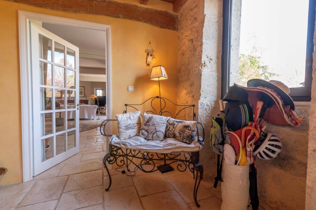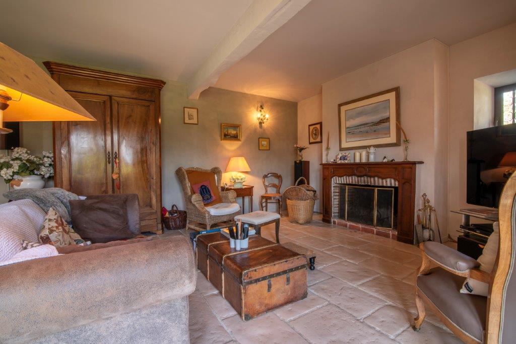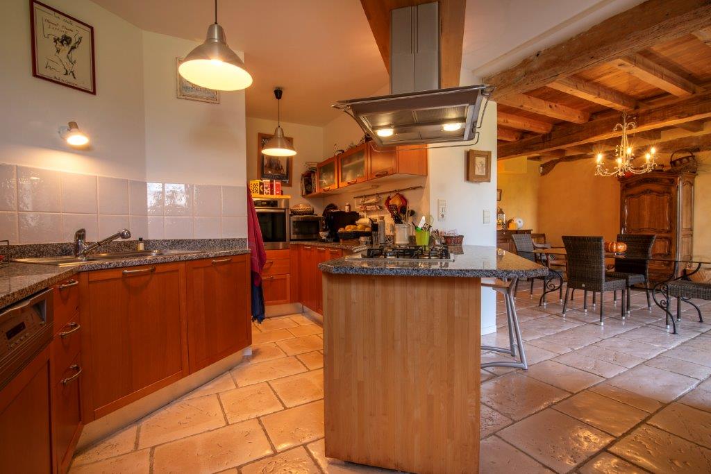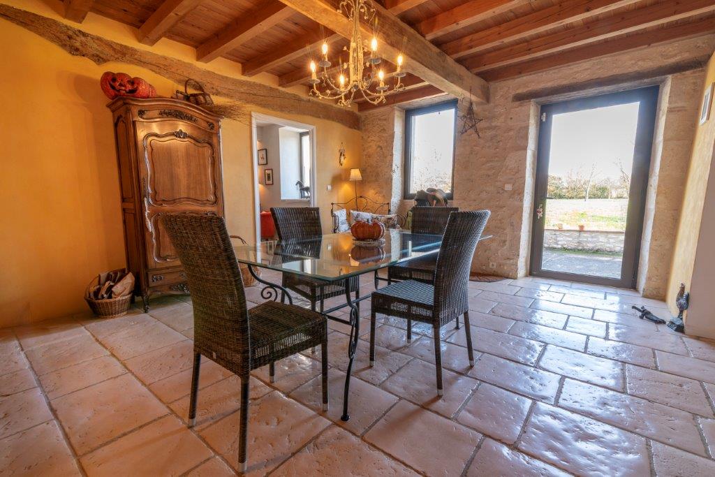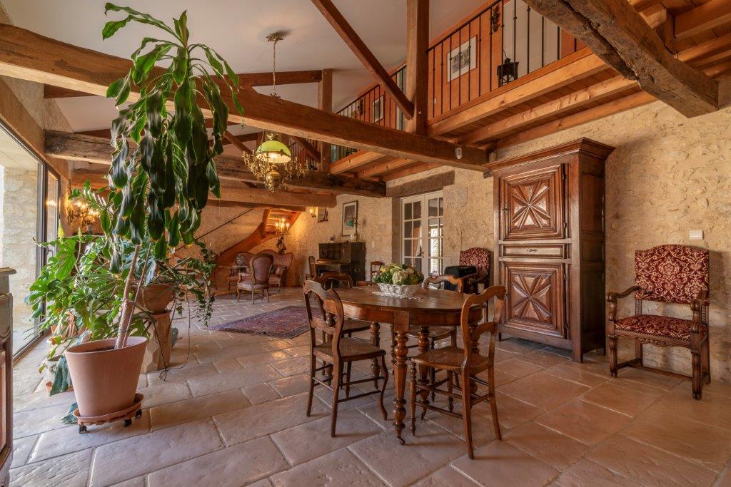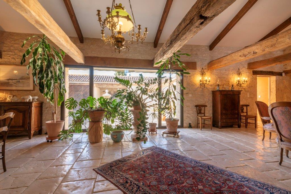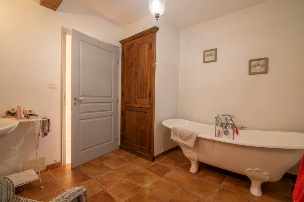 Indeling woonhuis met op de begane grond een eetkamer (21 m²) open naar de keuken, keuken (22 m²) met bijkeuken en wasruimte, woonkamer (48 m²) met open haard en toegang tot de tuin, grote salon/tweede woonkamer (60 m²) met glazen deuren naar de binnentuin, met balken en zichtbare stenen muren, slaapkamer (19 m²) met deur naar de tuin en tweede slaapkamer (21 m²) met oude broodoven, deur naar de tuin en stenen muren. Badkamer (9 m²) met o.a. douche, bad en wastafel. Gastentoilet. Kleedkamer/berging (9 m²).