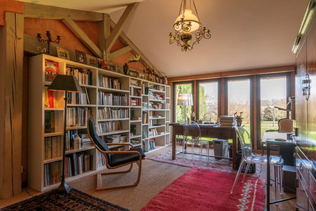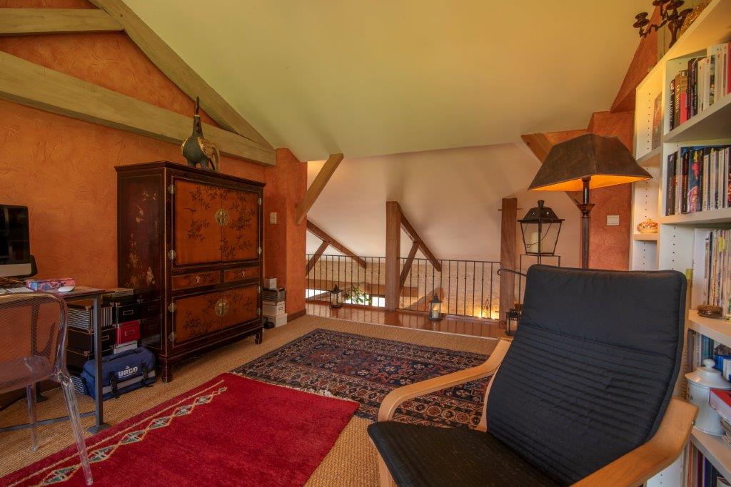 Op de verdieping bevindt zich een gang/mezzanine (13 m²) met houten vloer en smeedijzeren balustrade, slaapkamer (18 m²) met uitzicht op de tuin, kantoor (20 m²) met groot raam en uitzicht op de tuin, open naar de overloop, slaapkamer (18 m²) met donkere houten vloer en groot raam en gedeelde badkamer met o.a. douche, wastafel en toilet.