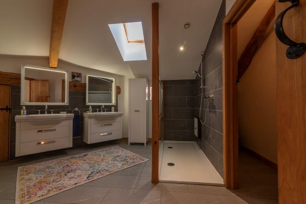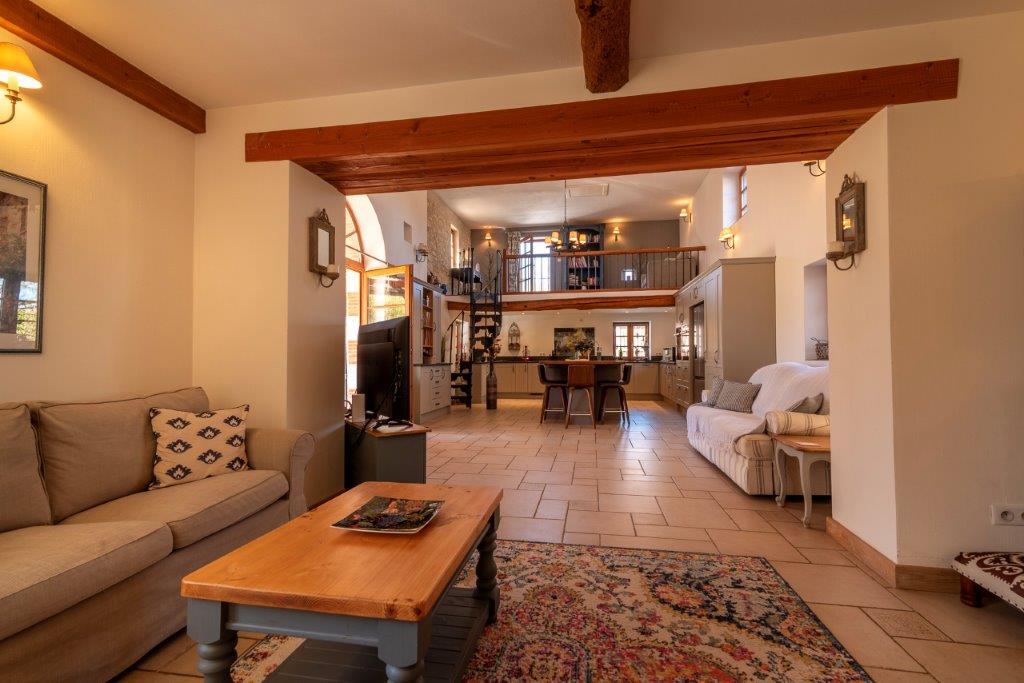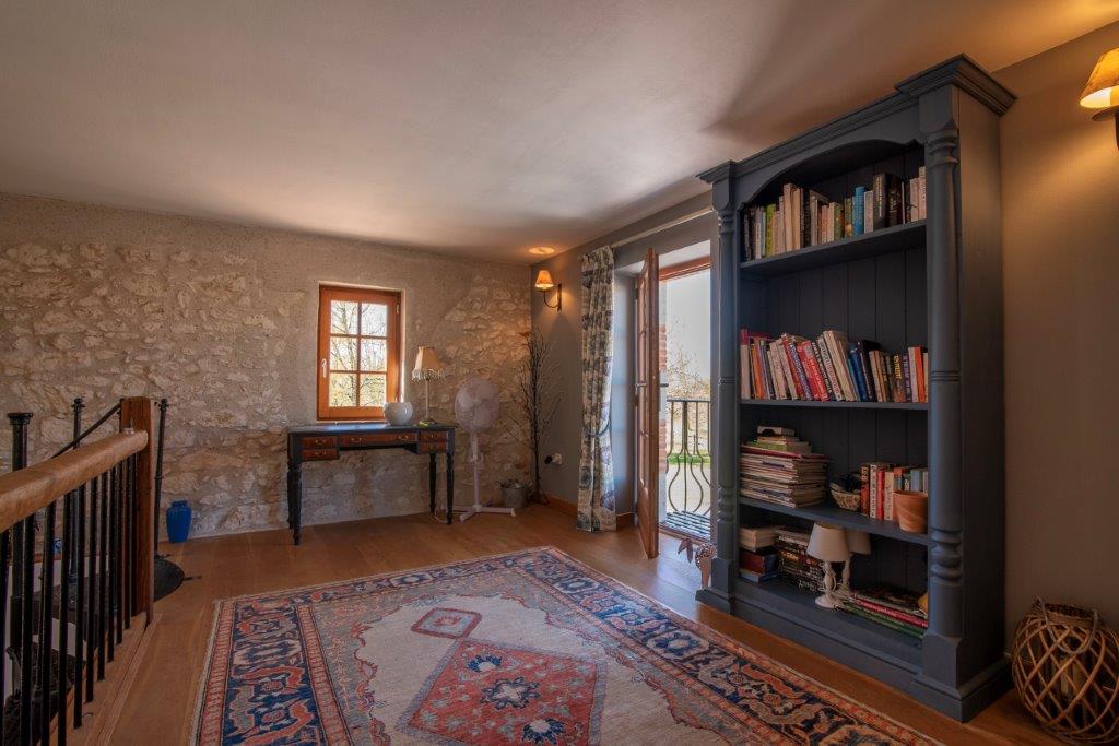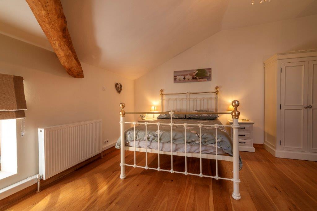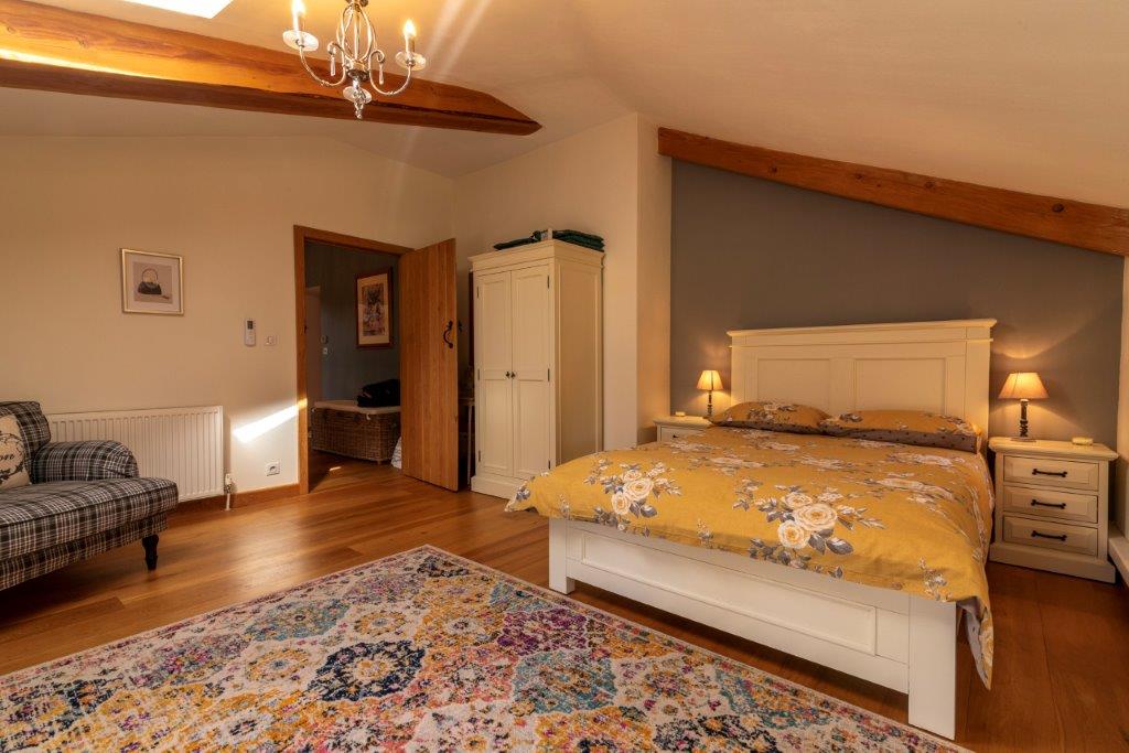 Bovenverdieping met mezzanine/vide (14 m²) vanuit de keuken, te gebruiken als slaapkamer/kantoor, hoofdslaapkamer (25 m²) met ensuite badkamer (18 m²) met bad, douche, wastafel en opbergruimte. Apart toilet. Slaapkamer (23 m²) met balkenplafond, derde slaapkamer (21 m²) met balkenplafond en een gedeelde badkamer (8 m²) met bad, douche en wastafel. Apart Toilet.