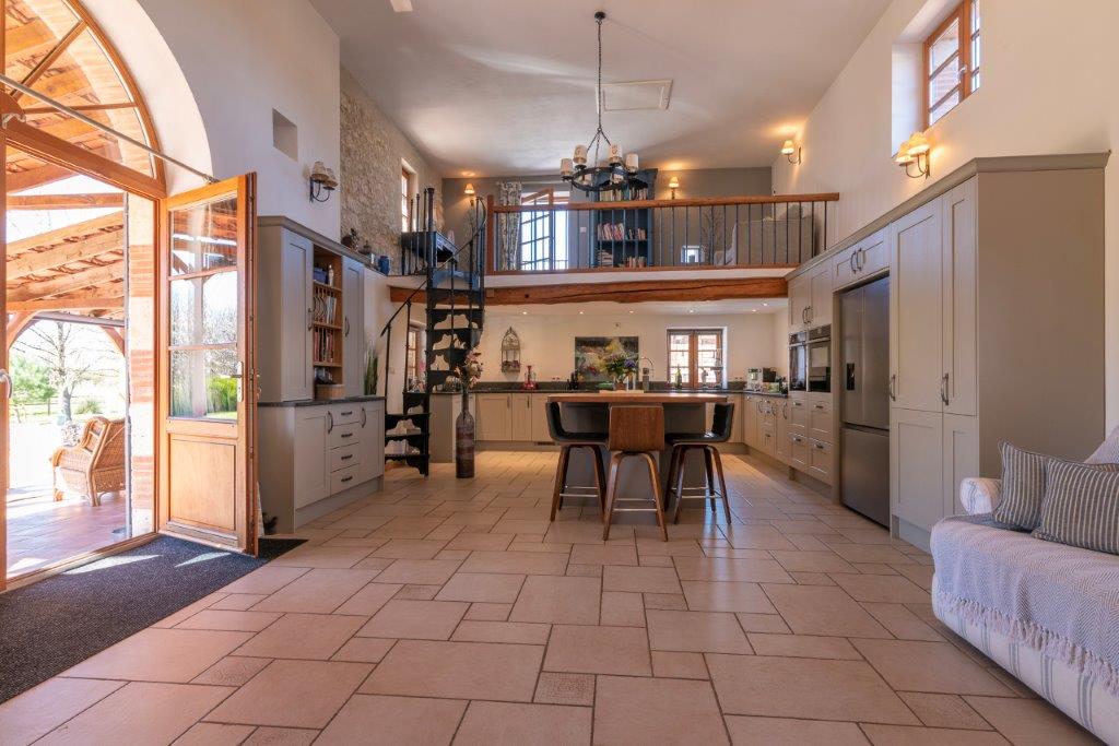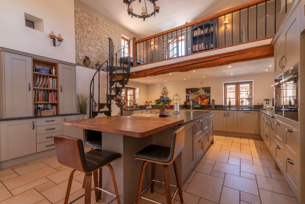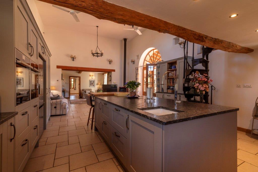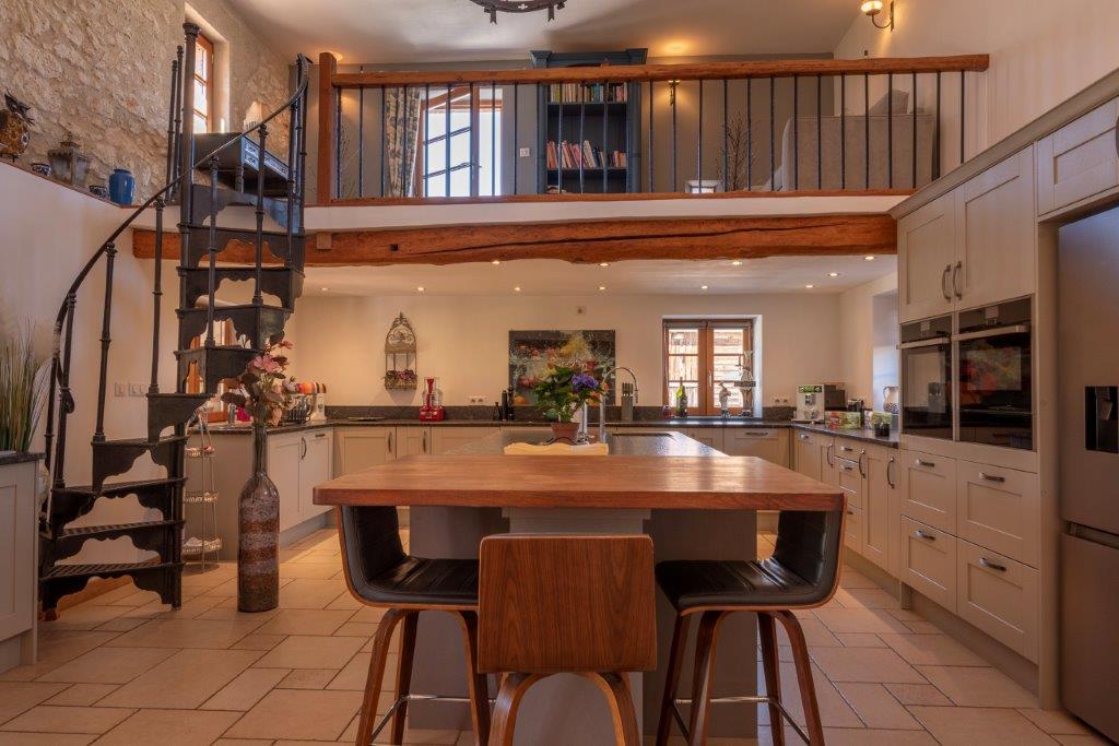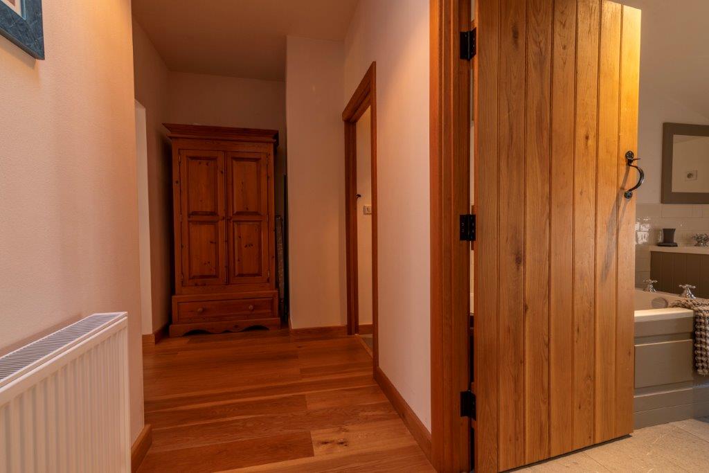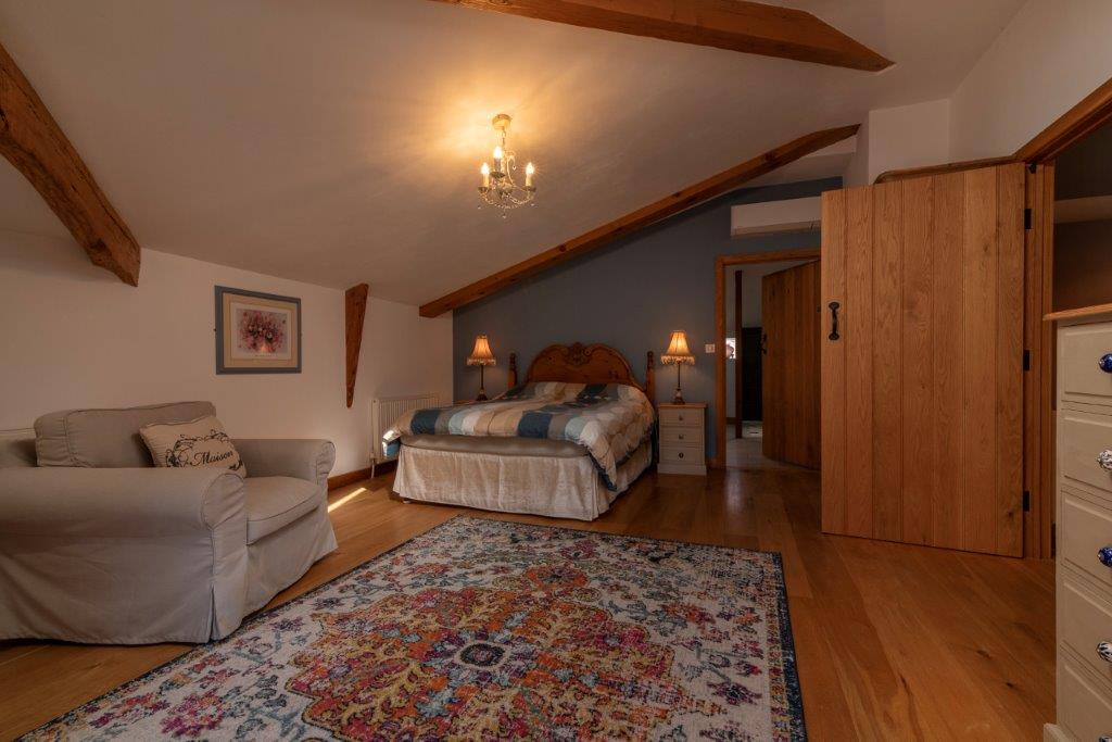 Bovenverdieping met mezzanine/vide (14 m²) vanuit de keuken, te gebruiken als slaapkamer/kantoor, hoofdslaapkamer (25 m²) met ensuite badkamer (18 m²) met bad, douche, wastafel en opbergruimte. Apart toilet. Slaapkamer (23 m²) met balkenplafond, derde slaapkamer (21 m²) met balkenplafond en een gedeelde badkamer (8 m²) met bad, douche en wastafel. Apart Toilet.