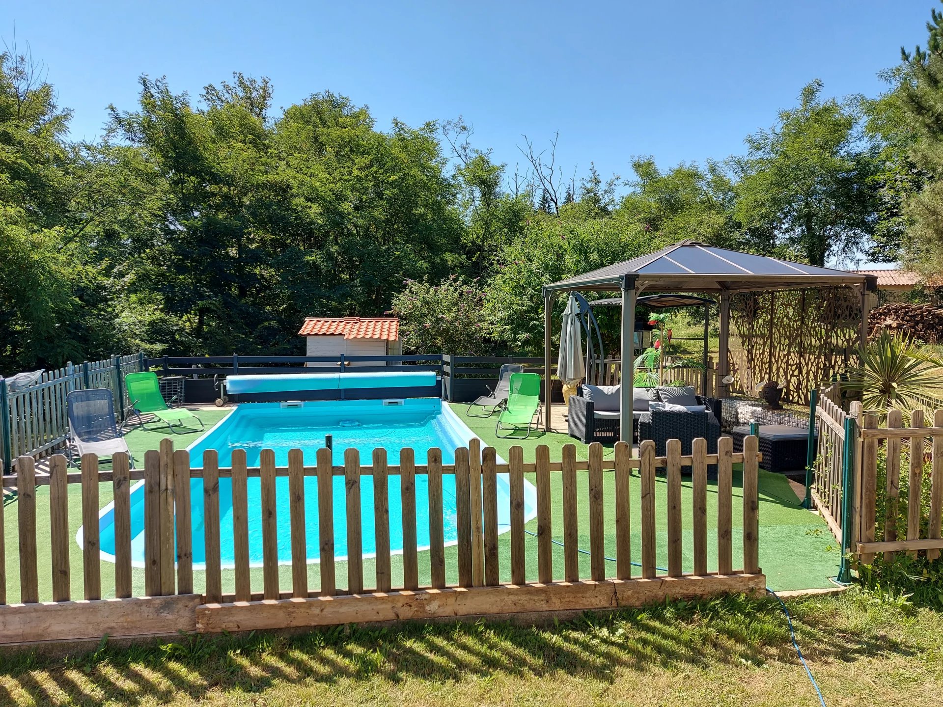 Moderne woning met garage en zwembad rustig gelegen op een perceel van ruim 6.500 m². Deze aangename gelijkvloerse woning heeft een woonoppervlak van 136 m² en is gebouwd in 2011. Het grote, bosrijke perceel beschikt over een zwembad van 9 bij 4 meter met een ontspanningsruimte onder een pergola. Rustige locatie op 5 minuten van een levendig dorp in de Bouriane met alle voorzieningen.