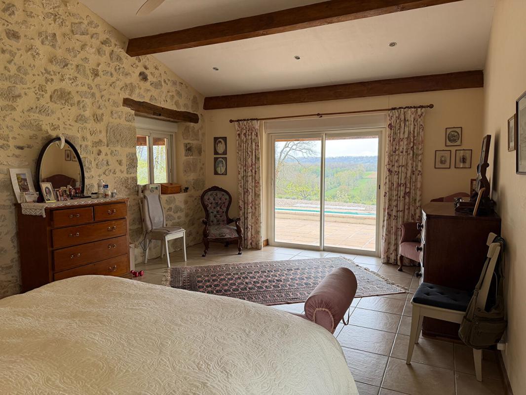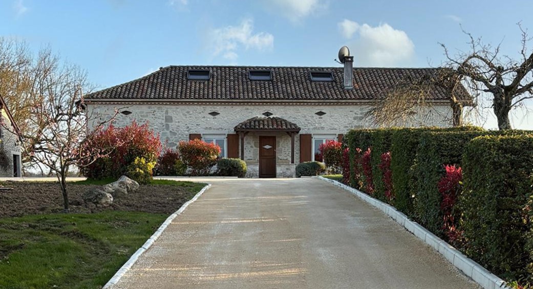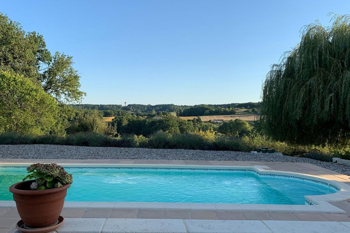 Lot-et-Garonne - Gascogne: mooi gerenoveerd natuurstenen woonhuis (4 sk, 4 bk) met goed zwembad van 10,5 bij 5 meter en grote schuur, gelegen op een heuvel met dominant uitzicht en ruim 2,3 hectare grond op 30 minuten ten zuiden van vliegveld Bergerac