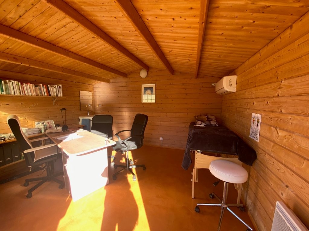 Houten chalet van 13 m², geschikt als gastenkamer of kantoor, met een wastafelmeubel, omkeerbare airconditioning, verwarming en een composttoilet.
