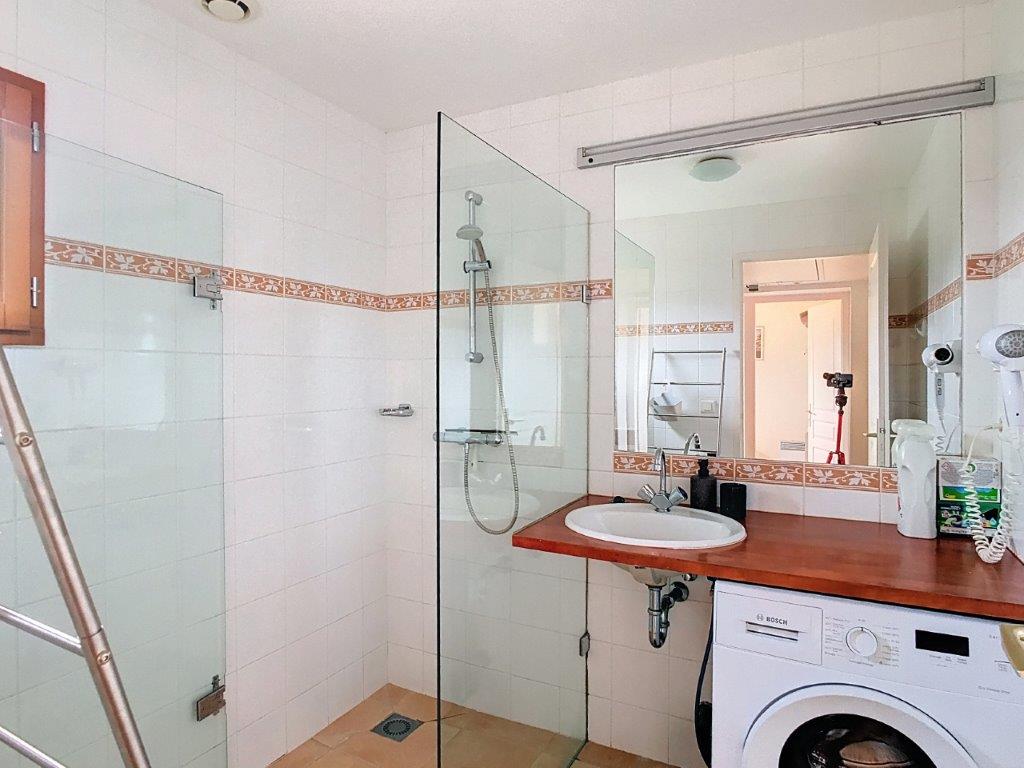Indeling woning met op de begane grond een lichte woonkamer met openslaande deuren die direct toegang geven tot het terras en de tuin. Open keuken, volledig uitgerust met o.a. een elektrische kookplaat met vier pitten, een afzuigkap, een vaatwasser, een combimagnetron en een koel-vriescombinatie. Verder zijn er twee slaapkamers. De verzorgde badkamer is uitgerust met een douche, een wastafel en een wasmachine. Separaat toilet.