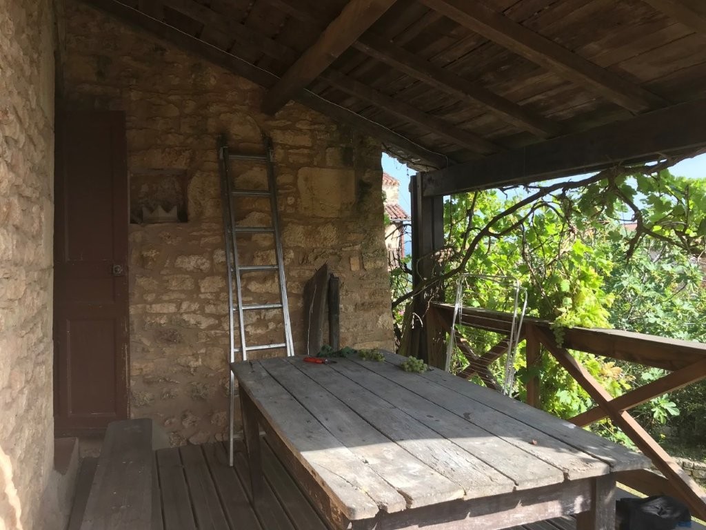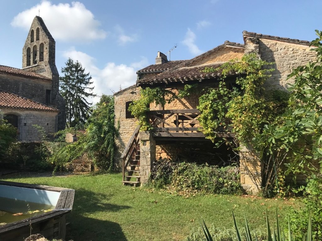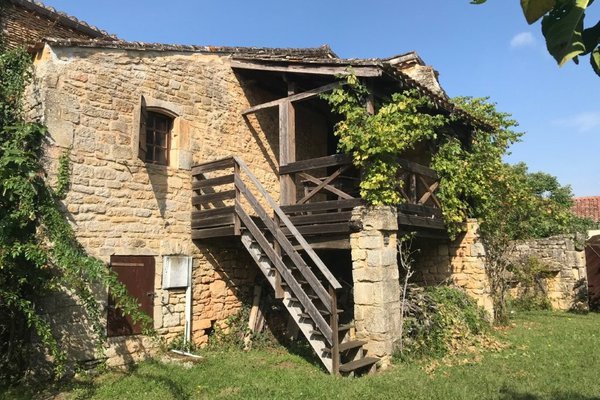 Lot - Occitanie: monumentaal natuurstenen woonhuis (2 sk, bk) met originele schouw, natuurstenen muren en balkenplafond, schuur en eigen tuin van 472 m², gelegen in een rustig dorpje vlakbij de rivier de Lot op 5 minuten van leuk stadje met voorzieningen