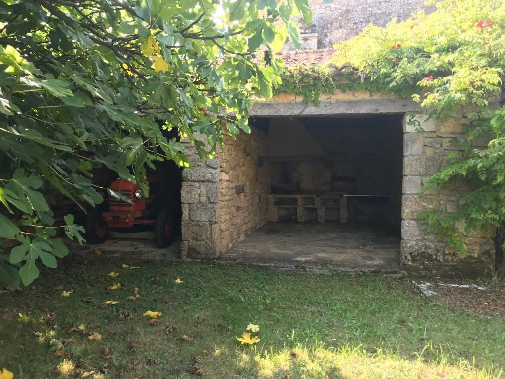 Een stenen schuur in gebruik als garage en zomerkeuken.