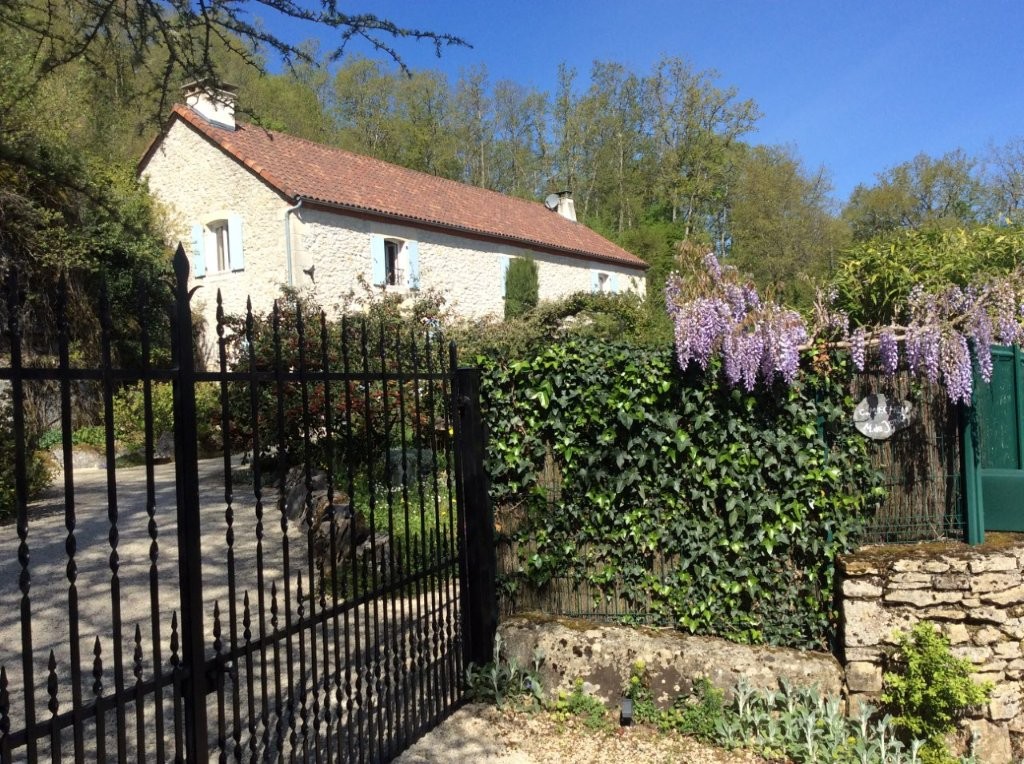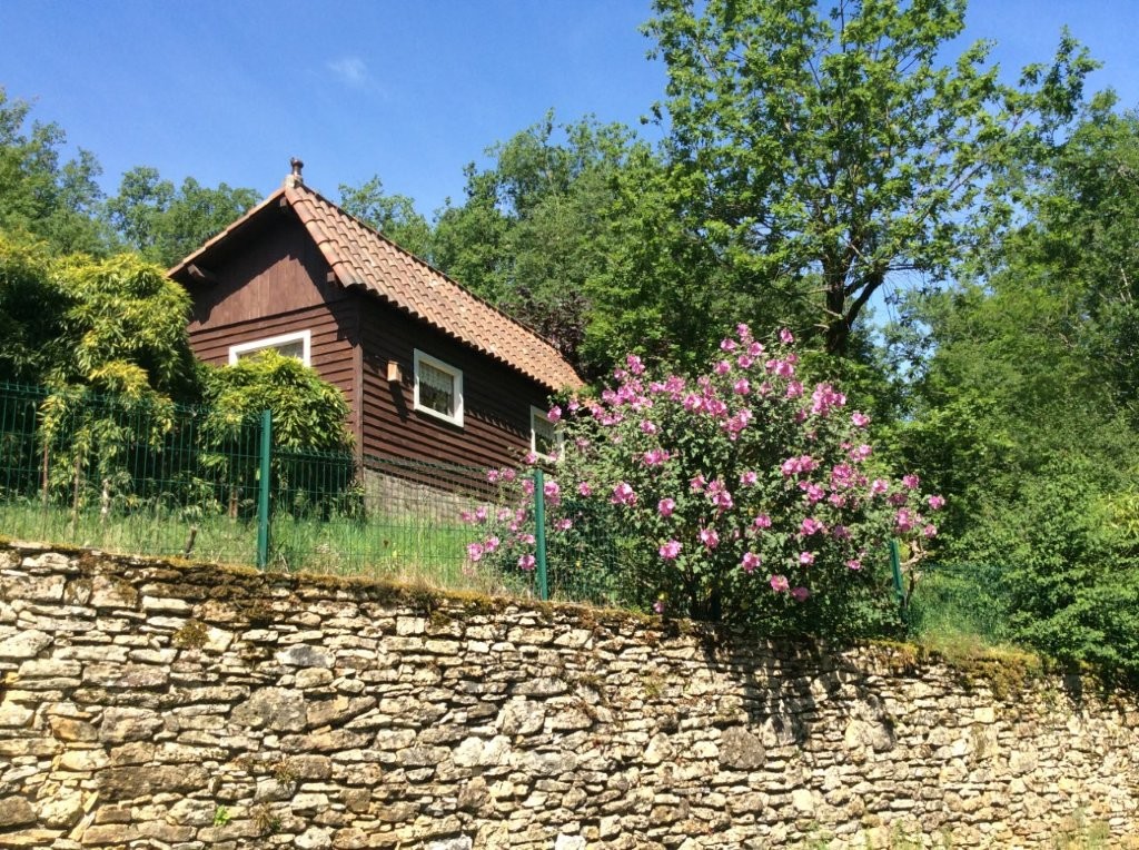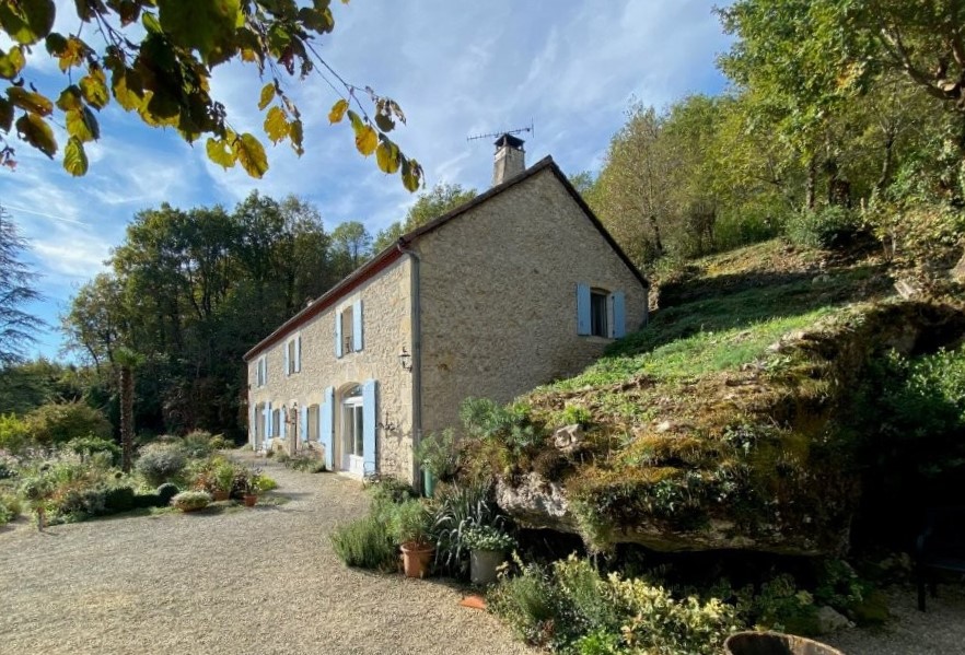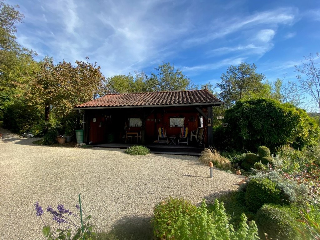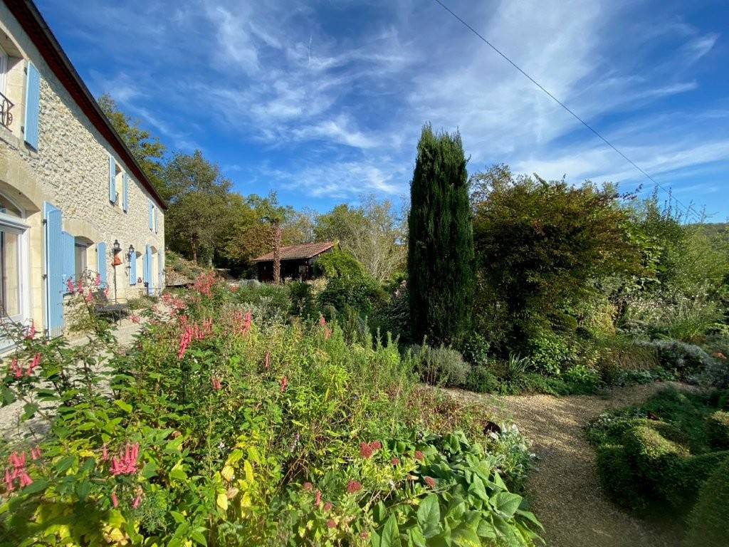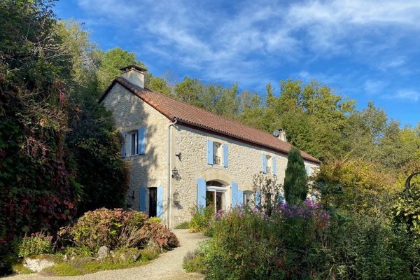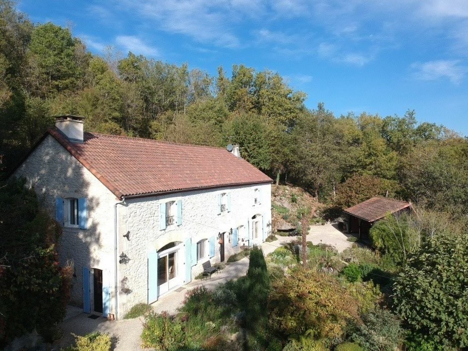 Lot - Occitanie: authentiek woonhuis 'en pierre' (5 sk, 2 bk) met enkele houten bijgebouwtjes, gelegen vlakbij een aantrekkelijk stadje aan de rivier de Lot op 1,4 hectare geaccidenteerd en bosrijk perceel; vrij uitzicht en zonder directe buren