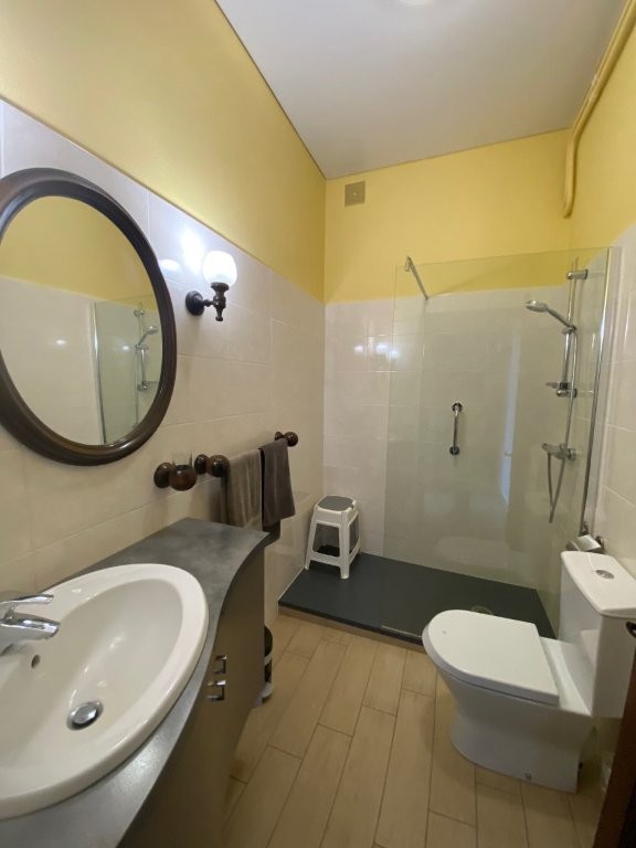 Op de begane grond is er een hal (5 m²) met tegelvloer, toilet, woonkamer van 32 m² met tegelvloer, tweede woonkamer/salon van 28 m² met een pellet-kachel en tegelvloer, keuken van 22 m² met wastafel, boven- en onderkasten, apparatuur en tegelvloer, bijkeuken/buanderie van 5 m² met wastafel, slaapkamer van 14 m² met tegelvloer en badkamer van 5 m² met o.a. inloopdouche, wastafelmeubel, toilet en tegelvloer.