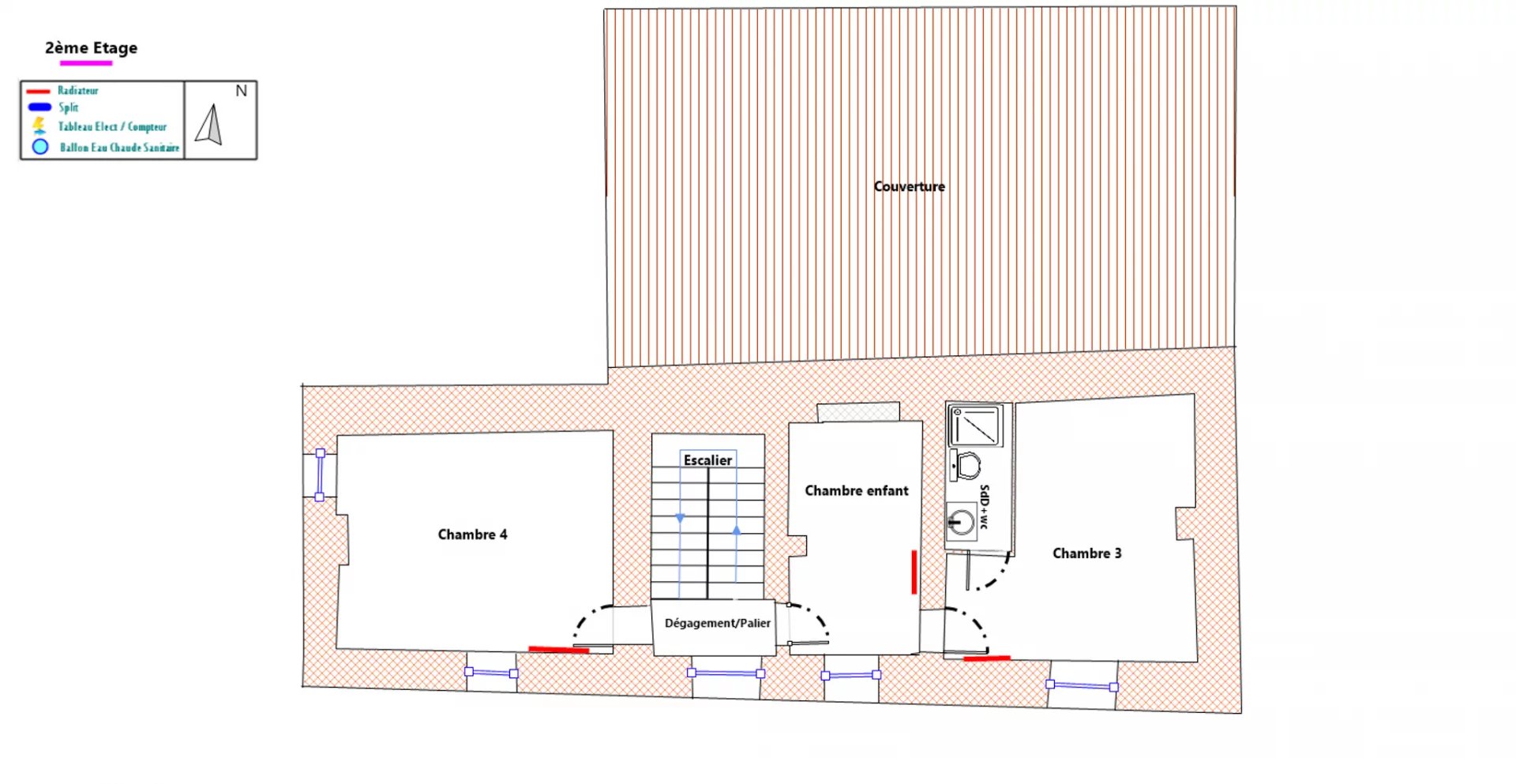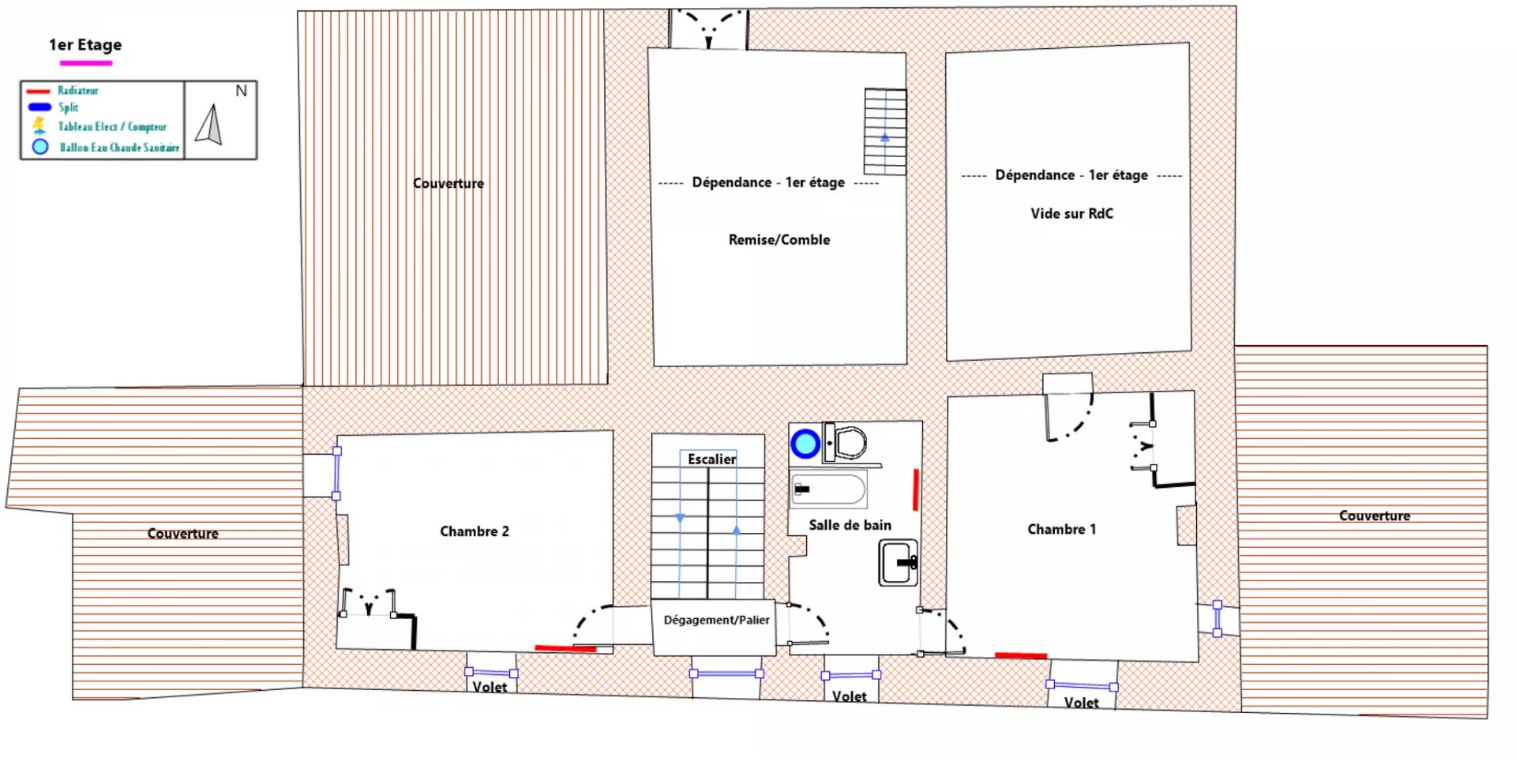 Op de eerste verdieping bestaat uit een eerste slaapgedeelte met twee zeer ruime slaapkamers (25 en 22 m²), een elegante badkamer en een toilet.