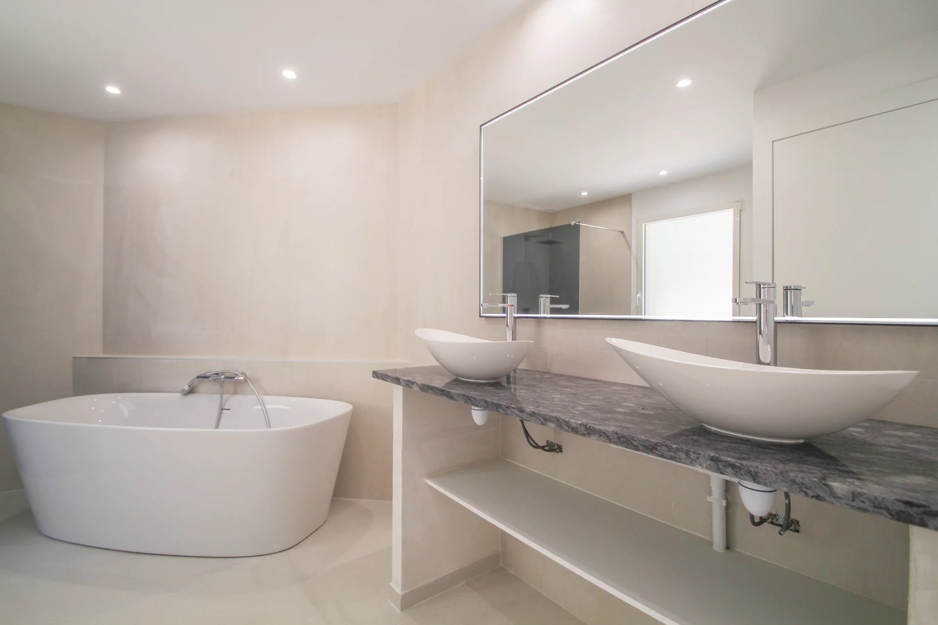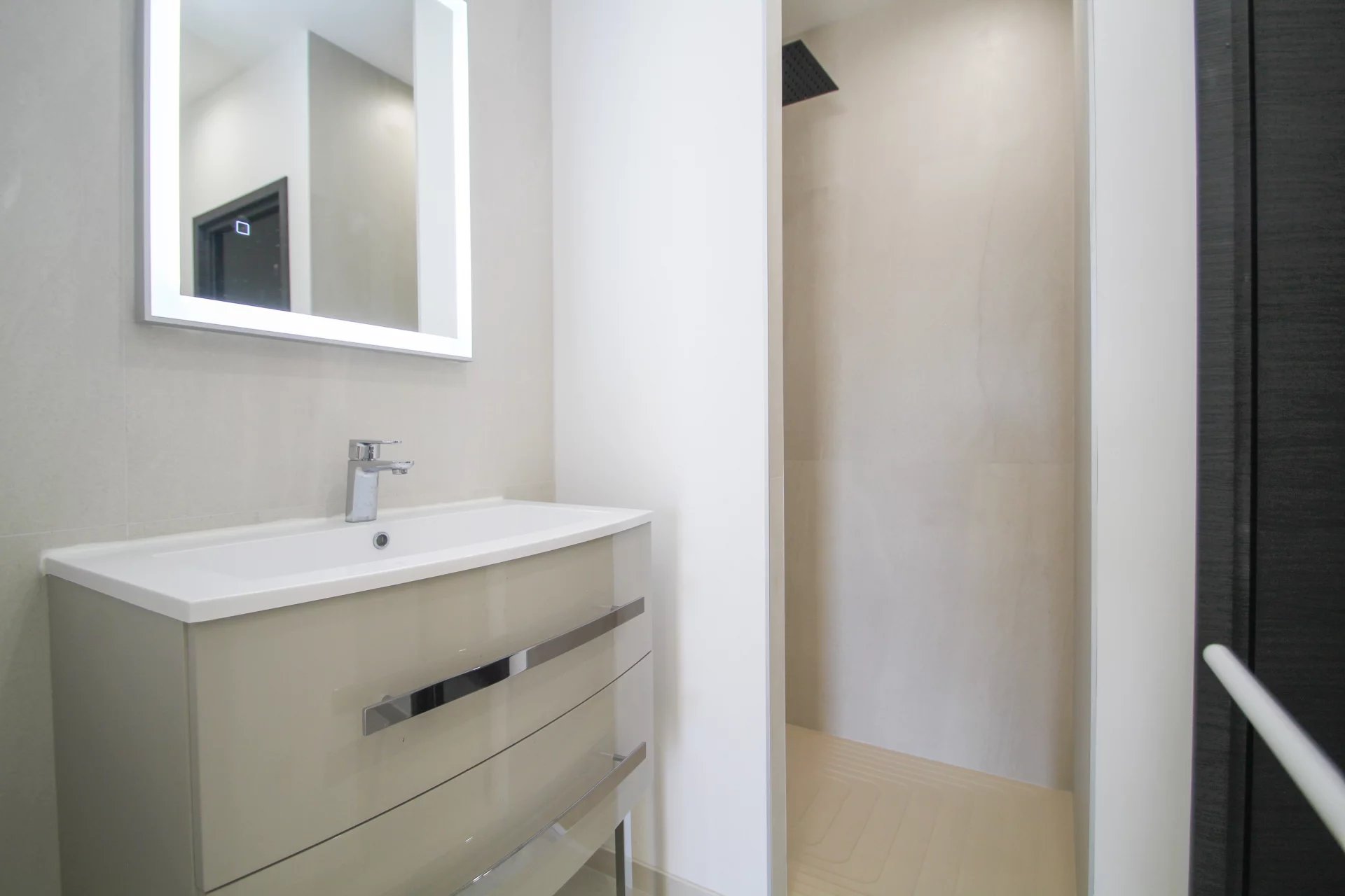 Op tuinniveau (onderste verdieping) met twee mooie slaapkamers met elk een badkamer en een grote kamer die gebruikt kan worden als tweede woonkamer, fitnessruimte of thuisbioscoop.