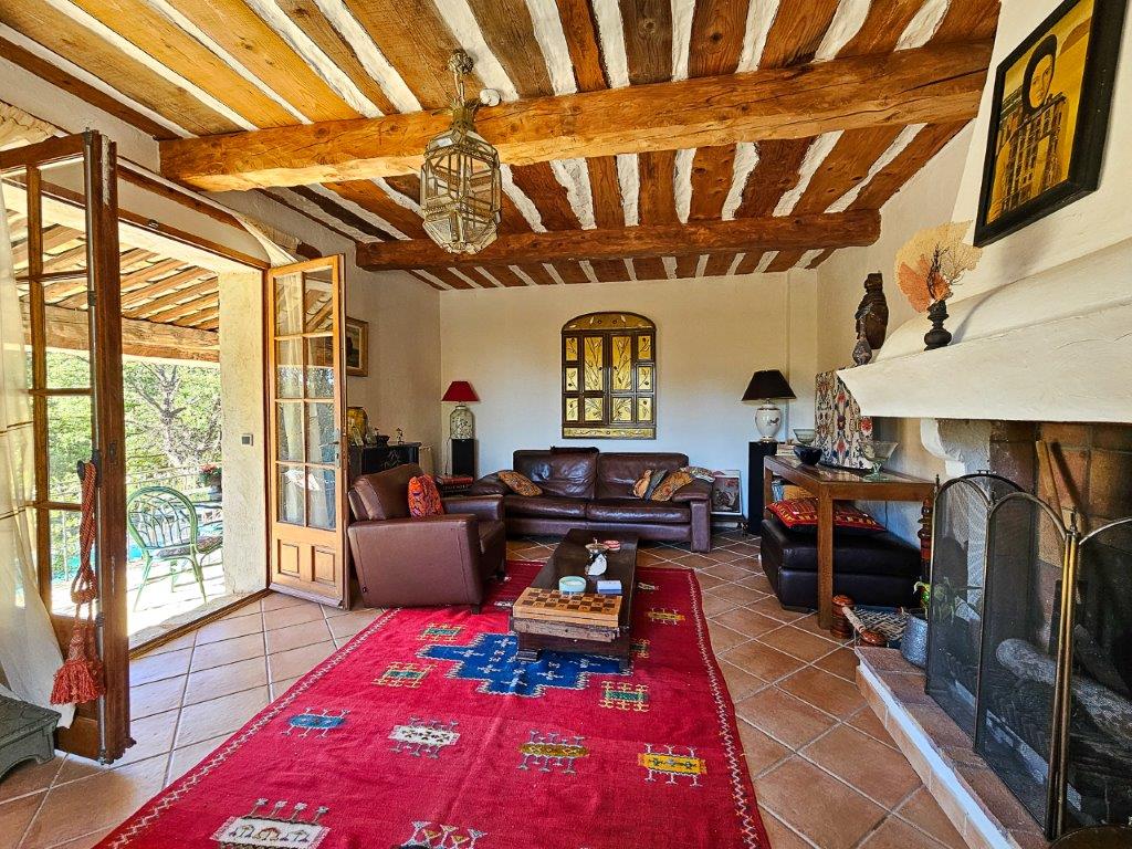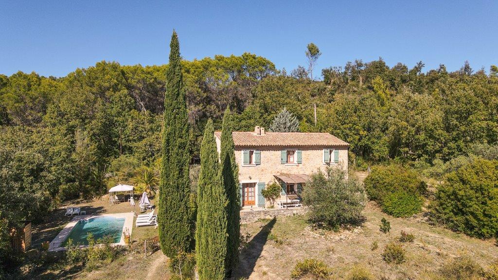 Provence - Var: charmante bastide (3 sk, 2 bk), gebouwd in 1997 in de authentieke Provençaalse stijl met balkenplafonds en schouw in woonkamer, rustig gelegen met zwembad van 12 bij 4 meter op 8.420 m² niet ver van centrum Flayosc en 40 minuten van zee