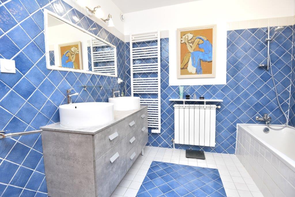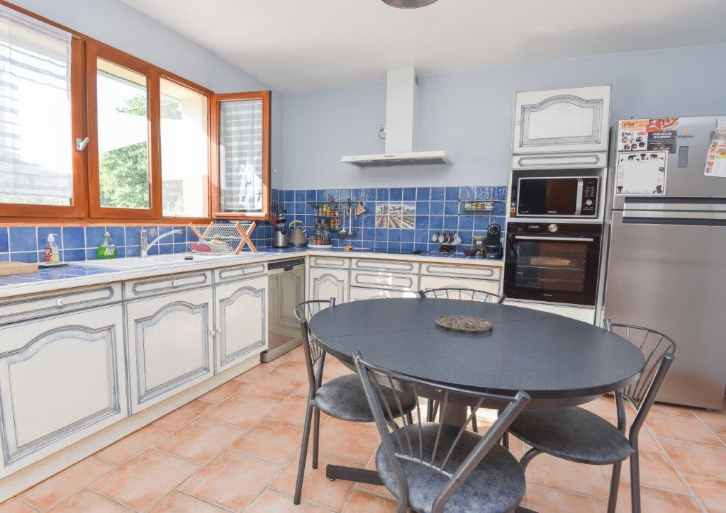 Indeling villa met op de begane grond een ruime hal, toilet, mooie trap naar de woonkamer met eethoek en openslaande deuren naar een groot schaduwrijk terras, perfect om in de zomer te dineren. De separate keuken heeft directe toegang tot het terras en een ruime wasruimte/buanderie, evenals de garage. Op de begane grond bevindt zich ook een slaapkamer met een eigen badkamer met o.a. douche en een apart toilet.