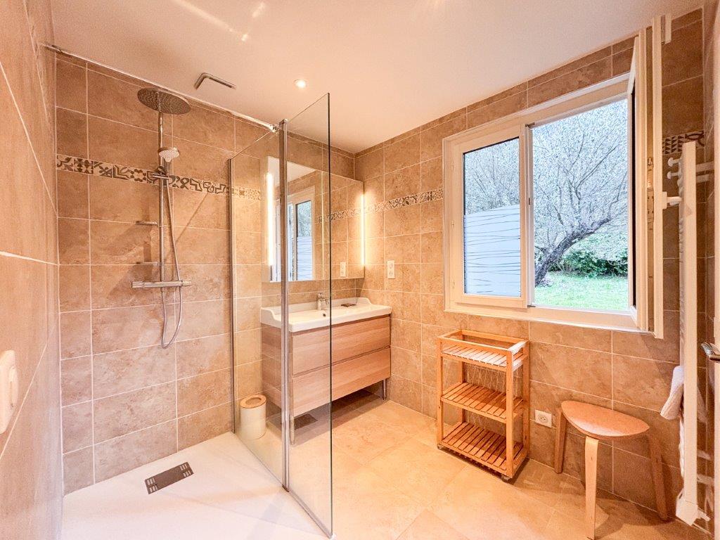 Boven bevindt zich het slaapgedeelte met drie slaapkamers, waarvan één met een eigen terras, een badkamer met o.a. douche en toilet, separaat toilet en een gedeelde derde badkamer. Grote ramen bieden een onbelemmerd uitzicht op de tuin.