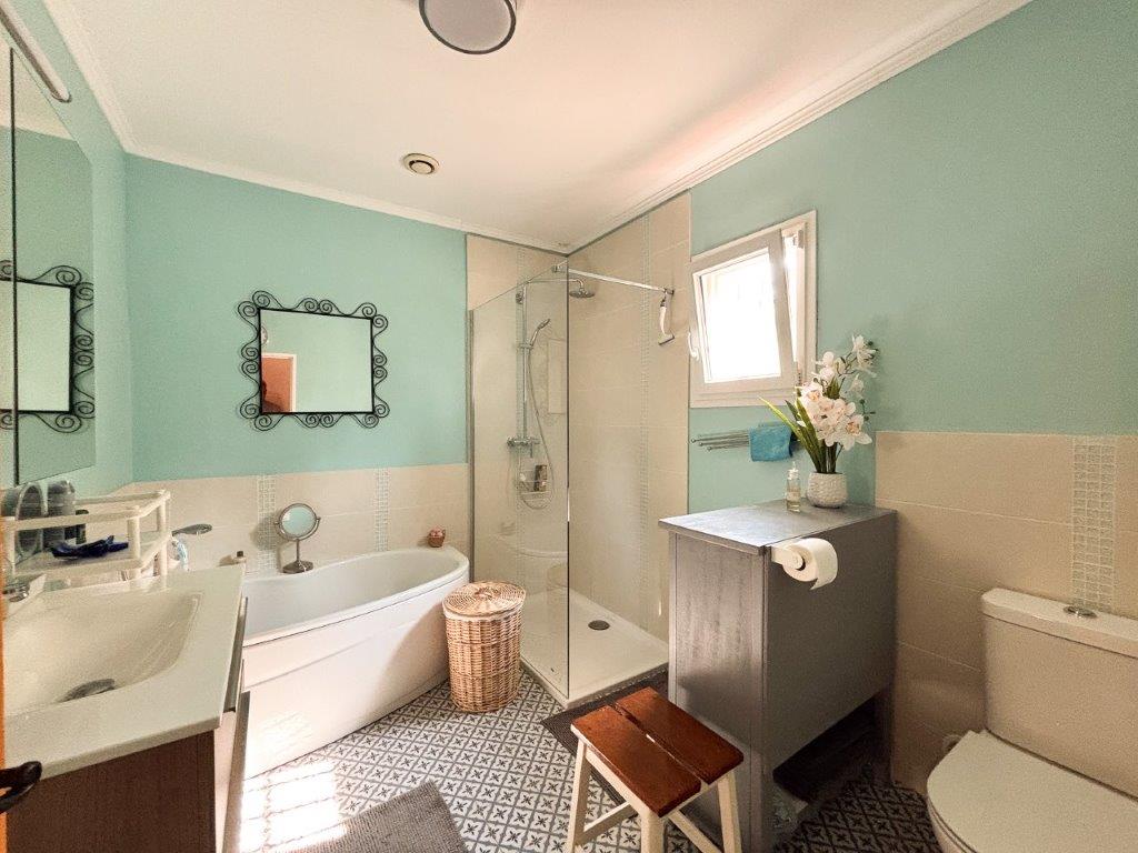 Indeling woonhuis met op de begane grond een hal met toegang tot een lichte woonkamer met houtkachel en toegang tot een heerlijk overdekt terras. Keuken in Provençaalse stijl met toegang tot een schaduwrijke zomerkeuken van 36 m². De villa heeft drie slaapkamers, een badkamer met toilet en een separaat toilet.