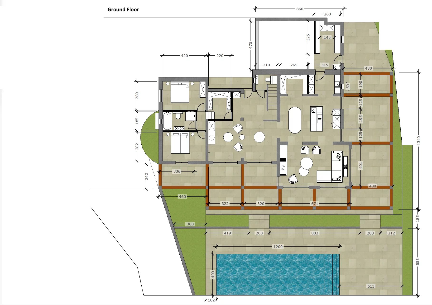 Indeling villa met op de begane grond een entree/hal, gastentoilet, woonkamer van 23 m² met een inzethaard, een luxe volledig ingerichte keukenruimte van 27 m² met bijkeuken, een eetkamer en een bureauhoek van 5 m², een tweede woonkamer/salon van 25 m² met een elektrische haard en toegang naar een ruim terras met adembenemende panoramisch uitzicht. Verder zijn er twee slaapkamers van 12 m², een ruime inloopkast/dressing en een badkamer.