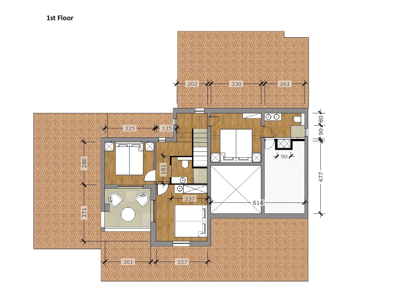 De bovenverdieping van deze villa omvat een slaapkamer van 12 m² met eigen badkamer plus twee slaapkamers (9 en 12 m²) die uitkomen op een groot balkon en een gedeelde badkamer.