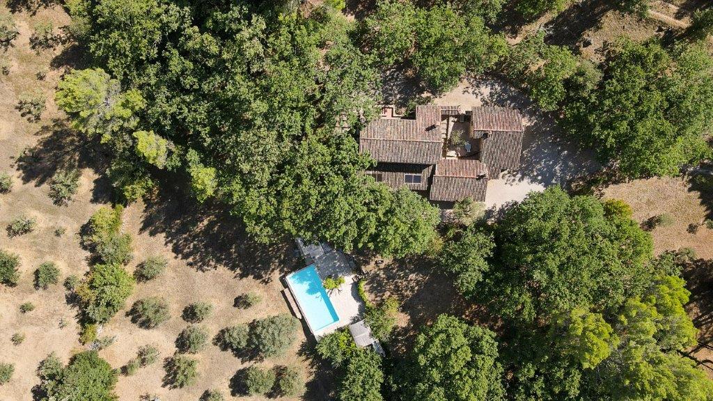Provence - Var: op een unieke, natuurlijke locatie zonder directe buren en met panoramisch uitzicht ligt deze natuurstenen Provençaalse villa met oorsprong uit de XIX-e eeuw, met zwembad en 4 hectare eigen grond; volop rust en stilte op een uurtje van zee
