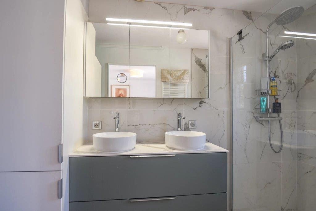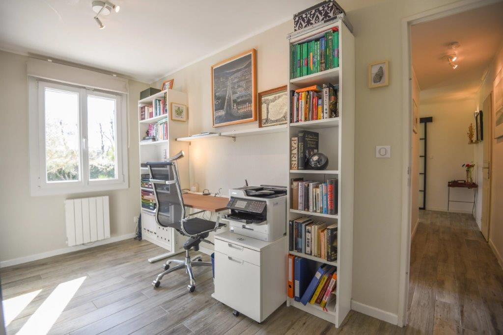 Indeling woonhuis met op de begane grond een entree met garderobe en toilet, lichte woonkamer met openslaande deuren naar het terras op het zuiden en een open, volledig uitgeruste keuken met schuifdeuren die toegang geven tot de achtertuin. De woning beschikt over een hoofdslaapkamer met eigen badkamer en toilet, drie extra slaapkamers (waarvan één in gebruik als werkkamer), badkamer en een wasruimte/buanderie.