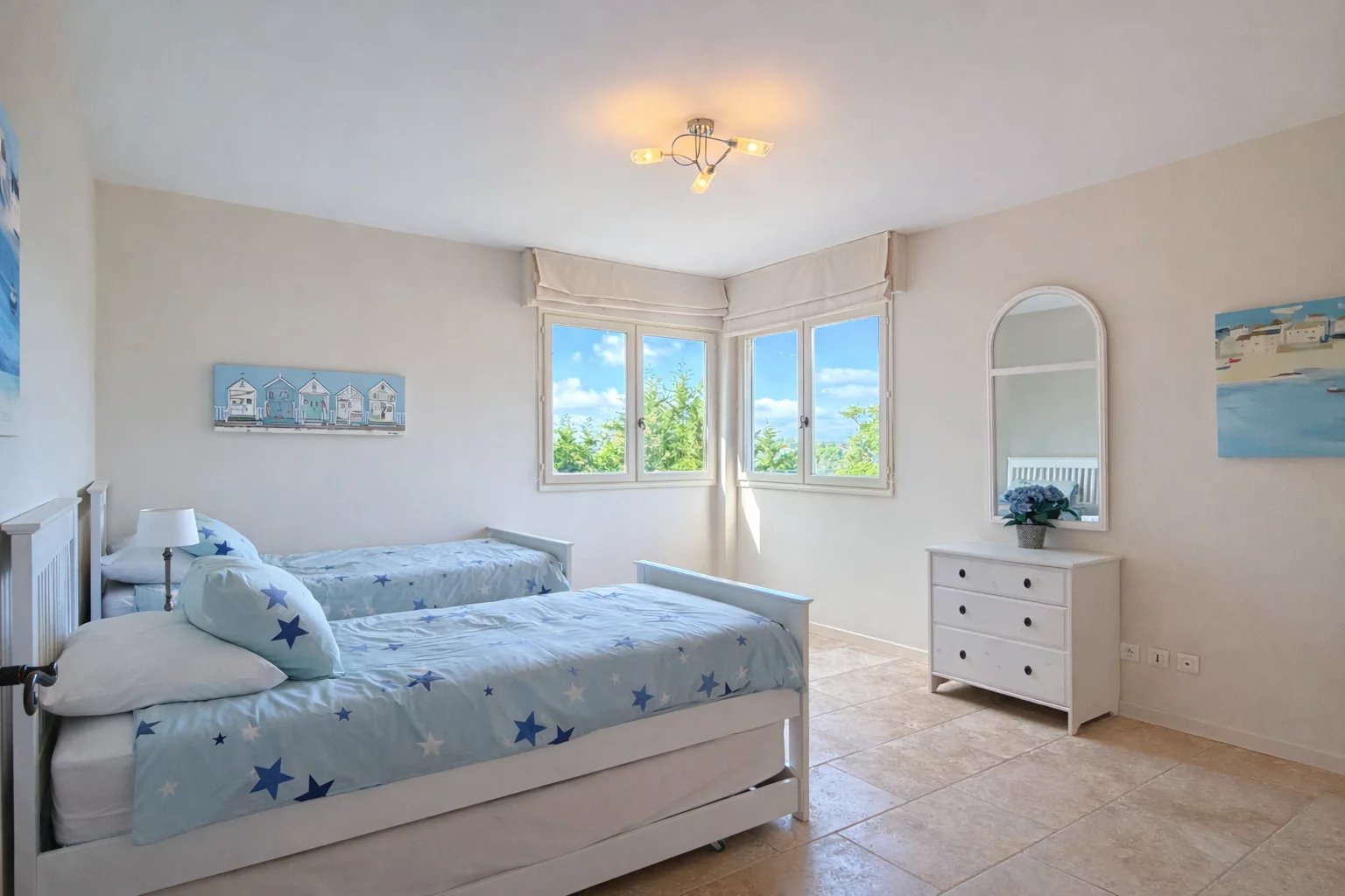 Een halve verdieping hoger zijn nog twee slaapkamers, elk met hun eigen badkamer.