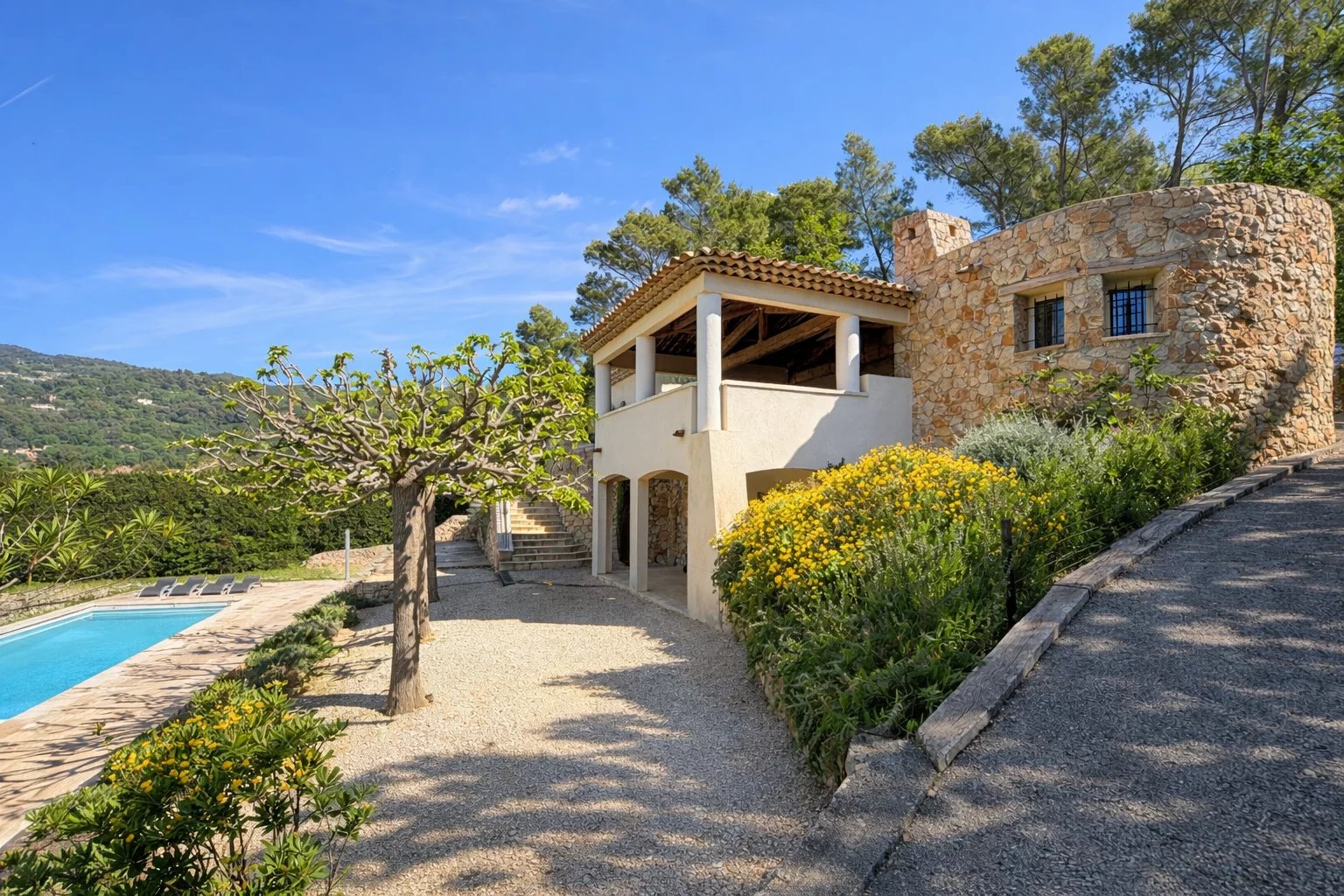 Provence - Var: schitterende topklassevilla (4 sk, 4 bk) met veel lichtinval en heerlijke uitzichten, hoger gelegen op ruim 5.800 m² met zwembad van 15 bij 5 meter en diverse overdekte terrassen; half uur van zee en vlakbij uitlopers zuidelijke Alpen